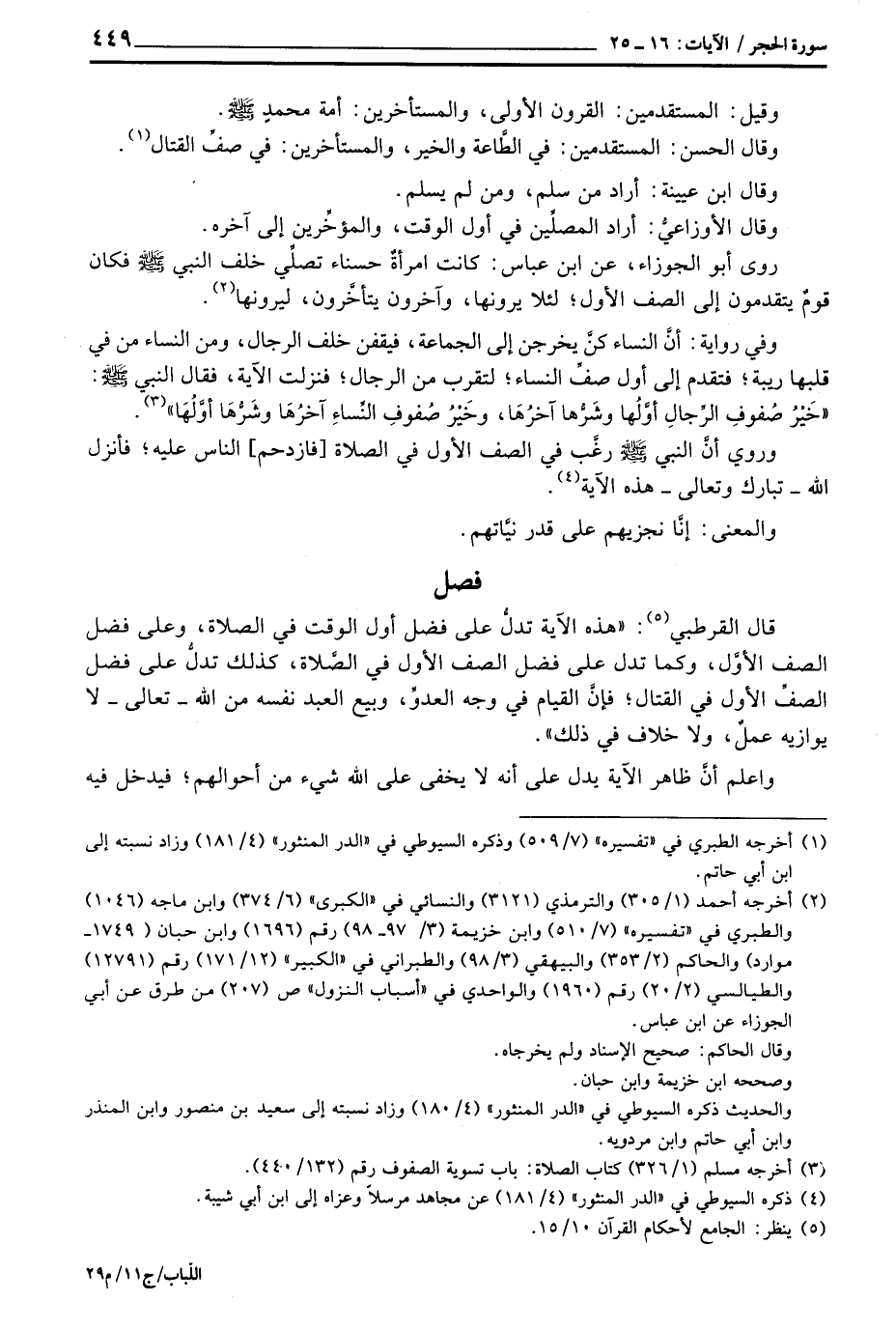 وفي رواية: أنَّ النساء كنَّ يخرجن إلى الجماعة، فيقفن خلف الرجال، من النساء من في قلبها ريبة، فتقدم إلى أول صفِّ النساء؛ لتقرب من الرجال؛ فنزلت الآية، فقال النبي صَلَّى اللَّهُ عَلَيْهِ وَسَلَّم َ: «خَيْرُ صُفوفِ الرِّجالِ أوَّلُها وشَرُّها أخرُهَا، وخَيْرُ صُفوفِ النِّساءِ آخرُهَا وشَّرُّهَا أوَّلُهَا» .