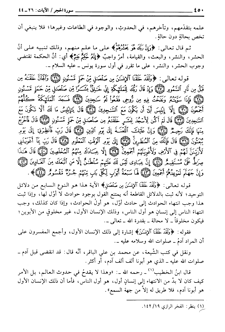 قال ابنُ الخطيب رَحِمَهُ اللَّهُ: «وها لا يقدحُ في حدوث العالم، بل الأمر كيف كان لا بدَّ من الانتهاء إلى إنسانٍ أول، هو أول الناس، فأما أن ذلك الإنسان الأول هو أبونا آدم، فلا طريق له إلاََّ من جهة السمع» .