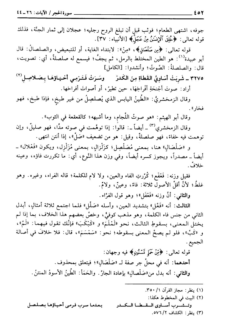 و «صَلْصَالٍ» هنا، بمعنى مُصَلْصِل؛ كزَلْزالٍ، بمعنى مُزَلْزِل، ويكون «فَعْلال» أيضاً مصدراً، ويجوز كسره أيضاً، وفي هذا النَّوع، أي: ما تكررت فاؤه، وعينه خلافٌ.