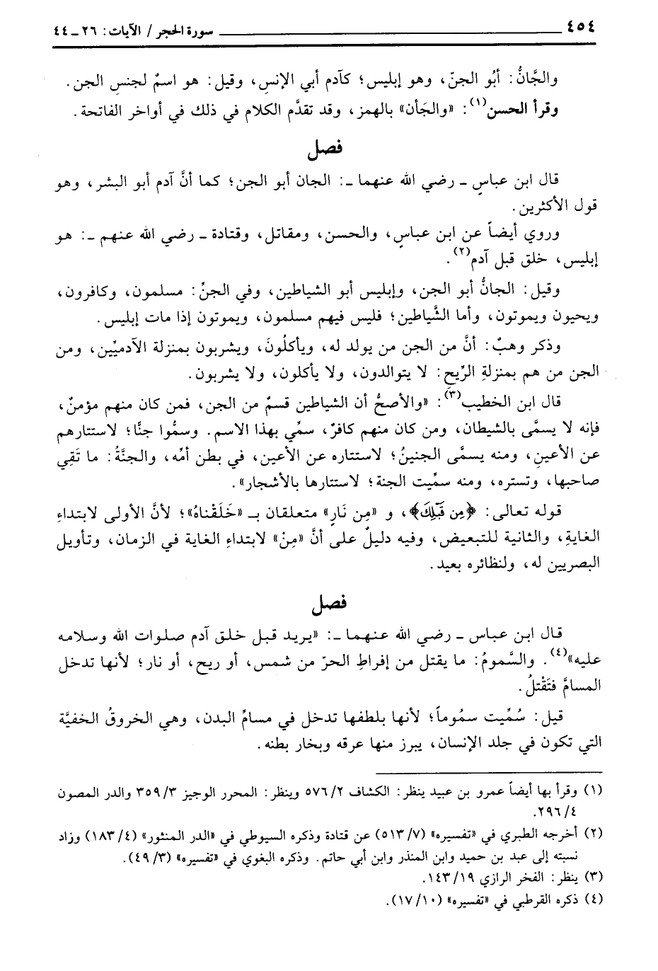 قال ابن عباس رَضِيَ اللَّهُ عَنْهما:» يريد قبل خلق آدم صلوات الله وسلامه عليه «ز والسَّمومُ: ما يقتل من إفراطِ الحرّ من شمس، أو ريح، أو نار؛ لأنها تدخل المسامَّ فتَقْتلُ.