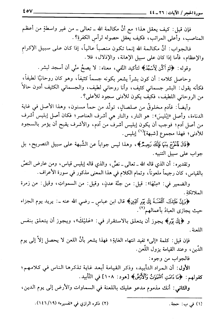 {قَالَ فاخرج مِنْهَا فَإِنَّكَ رَجِيمٌ} ، وهذا ليس جواباً عن الشُّبهة على سبيل التصريح، بل جواب على سبيل التنبيه.