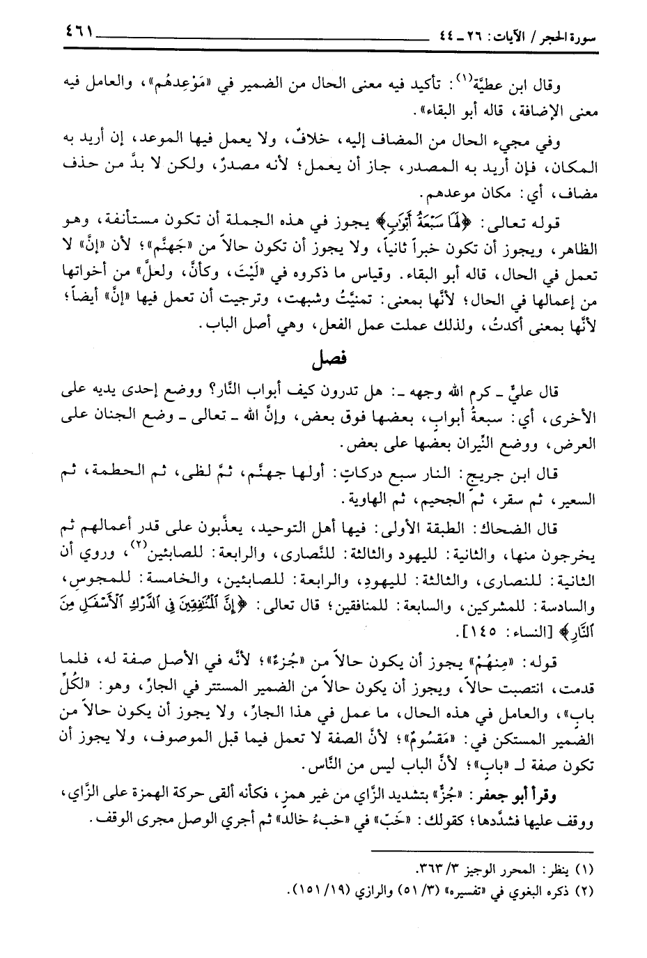 قال عليٌّ كرم الله وجهه: هل تدرون كيف أبوا النًَّار؟ ووضع أحدى يديه على الأخرى، أي: سبعةٌ أبوابٍ، بضعها فوق بعض، وأنَّ الله تعالى وضع الجنان على العرض، ووضع النِّيران بعضها على بعض.