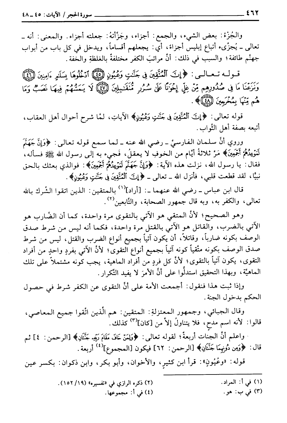وروي أنَّ سلمان الفارسيِّ رَضِيَ اللَّهُ عَنْه لما سمع قوله تعالى: {وَإِنَّ جَهَنَّمَ لَمَوْعِدُهُمْ أَجْمَعِينَ} [الحجر: 43] مَرَّ ثلاثةُ أيَّام من الخوفِ لا يعقلُ، فَجيء به إلى رسول الله صلى لله عليه وسلم فسأله، فقال: يا رسول الله، نزلت هذه الآية: {وَإِنَّ جَهَنَّمَ لَمَوْعِدُهُمْ أَجْمَعِينَ} [الحجر: 43] : فوالذي بعثك بالحق نبيًّا، لقد قطعت قلبي فأنزل الله تعالى {إِنَّ المتقين فِي جَنَّاتٍ وَعُيُونٍ} .