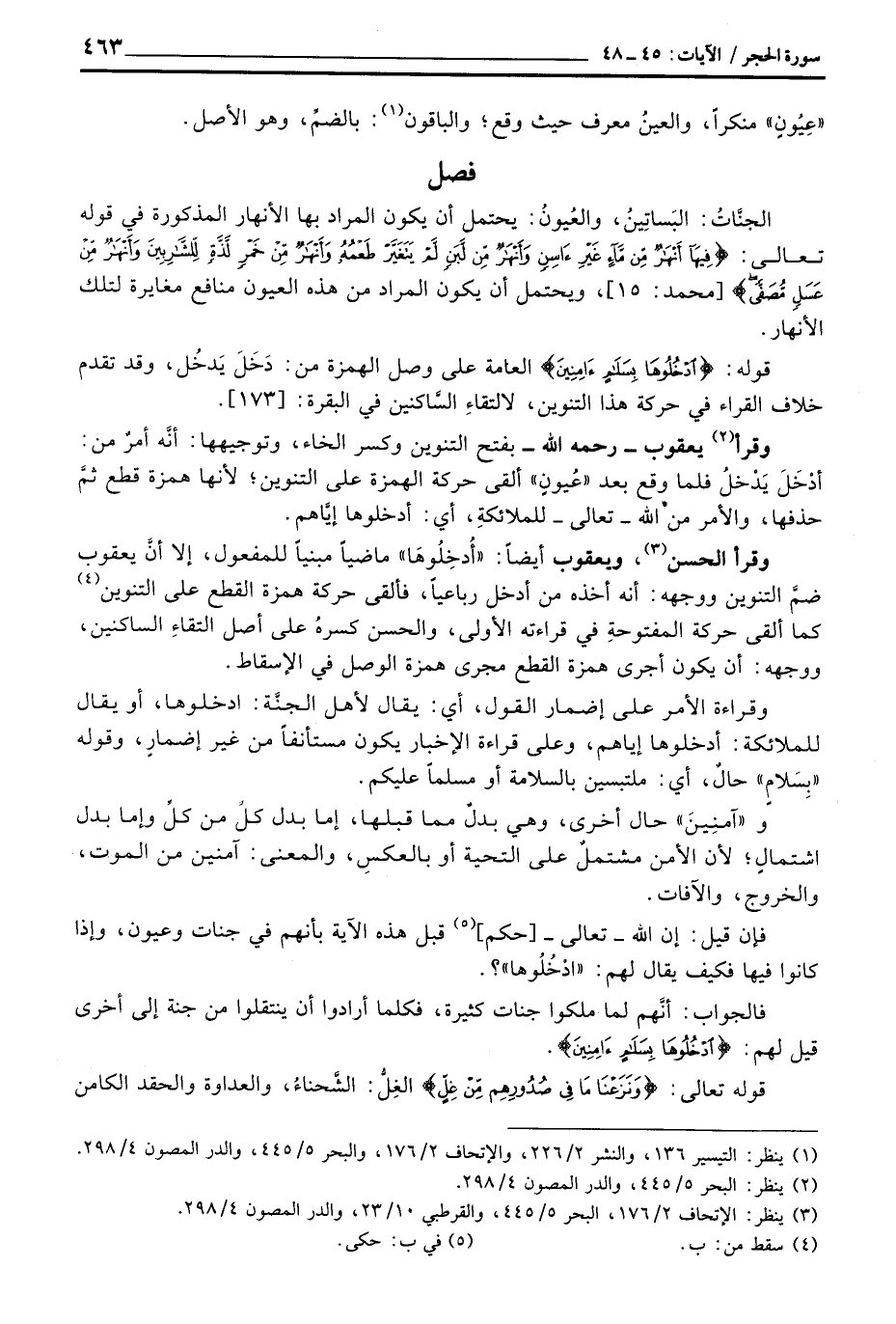 وقرأ يعقوب رَحِمَهُ اللَّهُ بفتح التنوين وكسر الخاء، وتوجيهها: أنَّه أمرٌ من: أدْخَلَ يَدْخلُ فلما وقع بعد «عُيونِ» ألقى حركة الهمزة على التنوين؛ لأنها همزة قطع ثمَّ حذفها، والأمر من الله تعالى، للملائكةِ، أي: أدخلوها أيَّاهم.