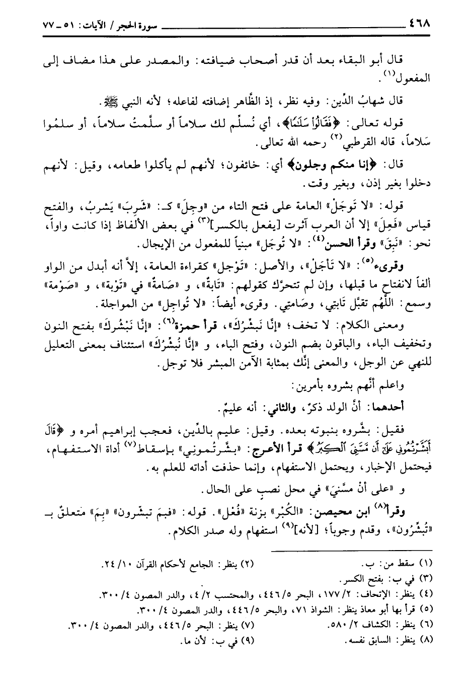 ومعنى الكلام: لاتخف؛ «إنَّا نَبشِّرُكَ» ، قرأ حمزة: «إنَّا نَبْشُركَ» بفتح النون وتخفيف الباء، والباقون بضم النون، وفتح الباء، و «إنَّا نُبشِّركَ» استئناف بمعنى التعليل للنهي عن الوجل، والمعنى إنَّك بمثابة الآمن المبشر فلا توةجل.