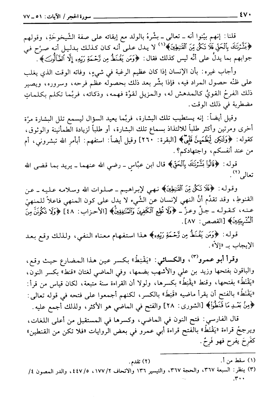 قال الفارسي: فتح النون في الماضي، وكسرها في المستقبل من أعلى اللغات، ويرجحُ قراءة «يَقْنَطُ» بالفتح قراءة أبي عمرو في بعض الروايات «فلا تكن من القنطين» كفَرِحشَ يفرح فهو فَرِحٌ.
