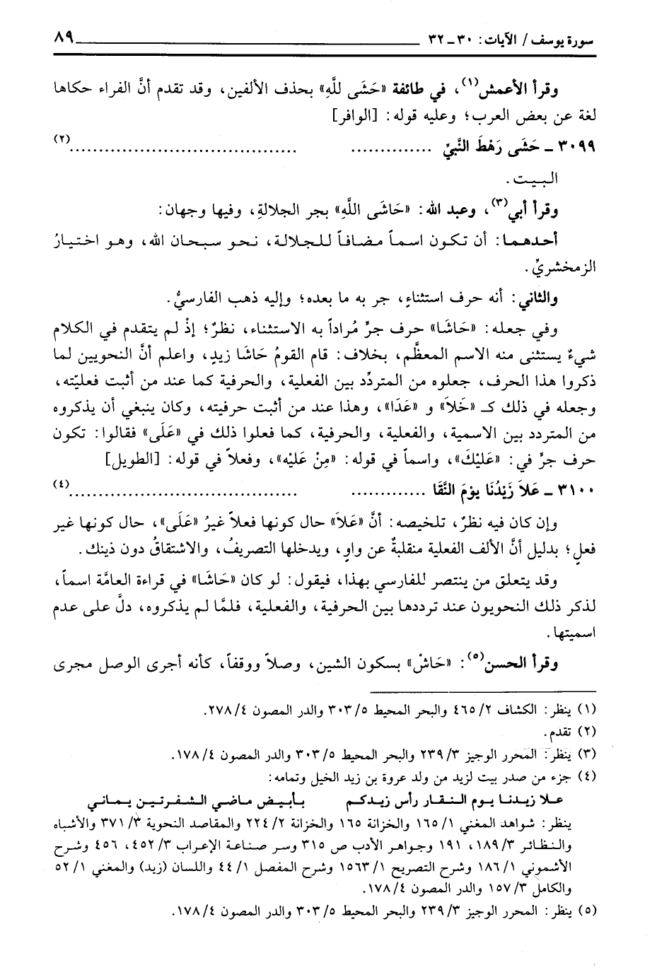 وفي جعله: «حَاشَا» حرف جرِّ مُراداً به الاستثناء، نظرٌ، إذْ لم يتقدم في الكلام شيءٌ يستثنى منه الاسم المعظَّم، بخلاف: قام القومُ حَاشَا زيدٍ، واعلم أنَّ النحويين لما ذكروا هذا الحرف، جعلوه من المتردِّد بين الفعلية، والحرفية كما عند من أثبت فعليّته، وجعله في ذلك ك «خَلاَ» و «عَدَ» ، وهذا عند من أثبت حرفيته، وكان ينبغي أن يذكروه من المتردد بين الاسمية، والفعلية، والحرفية، كما فعلوا ذلك في «عَلَى» فقالوا: يتكون حرف جرٍّ في «عَلْكَ» ، واسماً في قوله: «مِنْ عَليْه» ، وفعلاً في قوله: [الطويل]