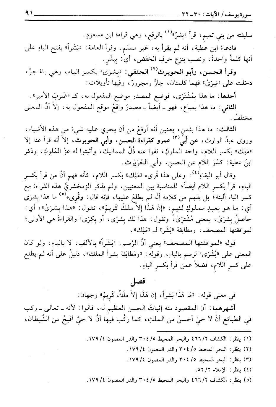 قوله» لموافقتها المصحف «يعني أنَّ الرَّسم:» بَشَراً «بالألفِ، لا بالياءِ، ولو كان المعنى على» بُشْرَى «لرسم بالياءِ، وقوله:» ومُطابَقة بشراً الملك «، دليلٌ على أنه لم يطلع على كسرِ اللامِ، فضلاً عمن قرأ بكسرِ الباءِ.