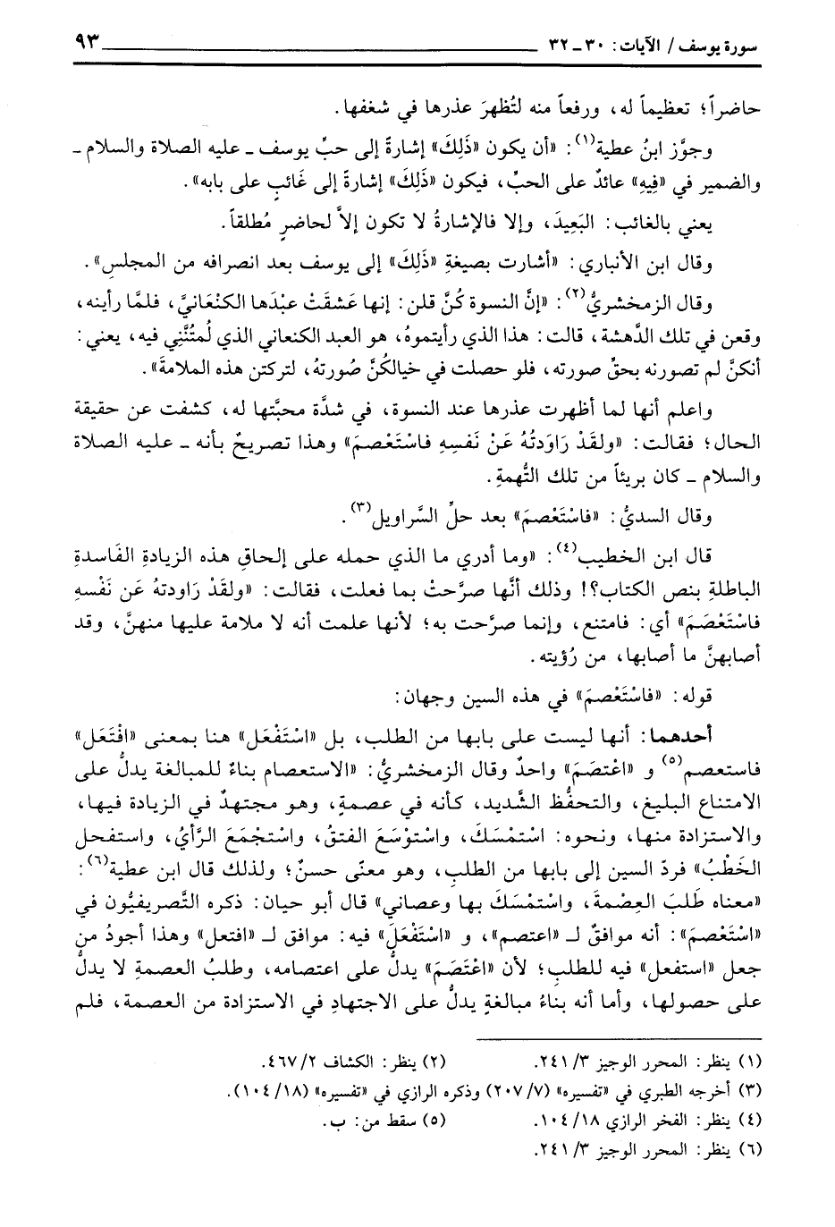 أحدهما: أنها ليست على بابها من الطلب، بل «اسْتَفْعَل» هنا مبعنى «افْتَعَل» فاستعصم و «اعْتصَمَ» واحدٌ وقال الزمخشريُّ: «الاستعصام بناءُ للمبالغة يدلُّ على الامتناع البليغ، والتحفُّظ الشَّديد، كأنه في عصمةِ، وهو مجتهدٌ في الزيادة فيها، والاستزادة منها، ونحوه: اسْتمْسَكَ، واسْتوْسَعَ الفتقُ، واسْتجْمَعَ الرَّأيُ، واستفحل الخَطْبُ» فردّ السين إلى بابها من الطلبِ، وهو معنّى حسنٌ، ولذلك قال ابن عطية: «معناه طَلبَ العِصْمَةَ، واسْتمْسَكَ بها وعصاني» قال أبو حيان: ذكره التَّصريفيَّون في «اسْتَعْصَم» : أنه موافقٌ ل «اعتصم» ، و «اسْتَفْعَلَ» فيه: موافق ل «افتعل» وهذا أجودُ من جعل «استعفل» فيه للطلبِ؛ لأن «اعْتَصَمَ» يدلُّ على اعتصامه، وطلبُ المعصمةِ لا يدلُّ على حصولها، وأما أنه بناءُ مبالغةٍ يدلُّ على الاجتهادِ في الاستزادة من العصمة، فلم