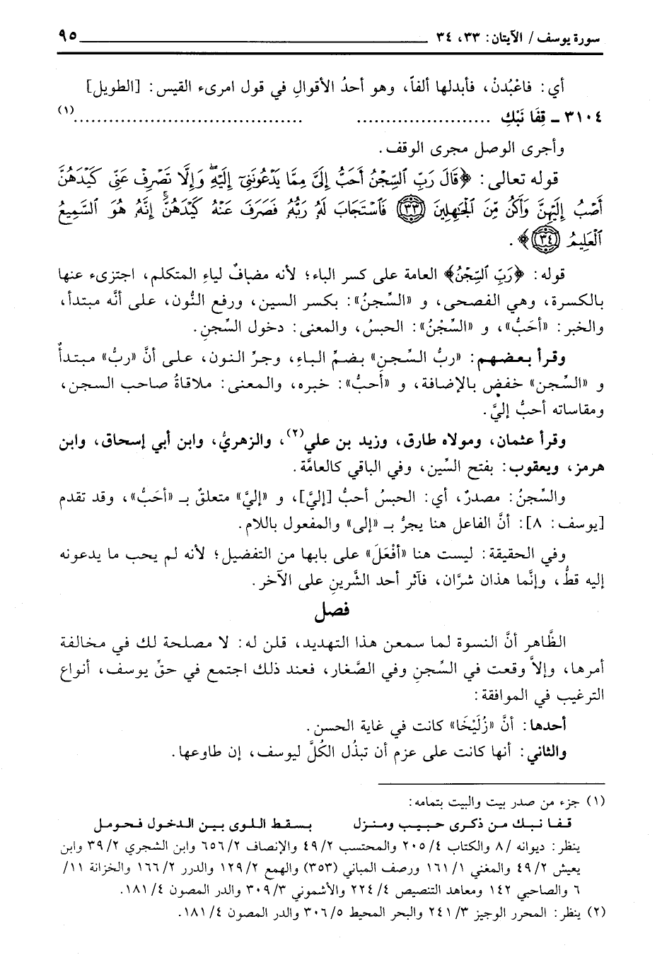 قوله: {رَبِّ السجن} العامة على كسر الباء؛ لأنه مضافٌ لياء المتكلم، اجتزىء عنها باكسرة، وهي الفصحى، و «السِّجنُ» : بكسر السين، ورفع النُّون، على أنَّه مبتدأ، والخبر: «أحَبُّ» و «السِّجنُ» الحبسُن والمعنى: دخول السِّجنِ.
