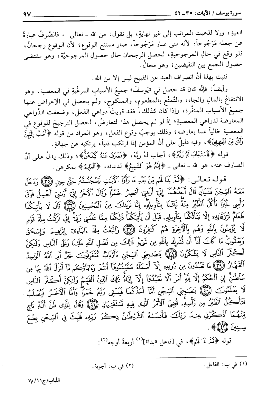 وأيضاً: فإنَّه كان قد حصل في «يُوسفَ» جميعُ الأسباب المرغِّبةِ في المعصية، وهو الانتفاعُ بالمالِ والجاه، والتَّمتُّع بالمطعومِ، فقد فويتْ دواعي الفعل، وضعفت الدَّواعي المعارضة لدواعي المعصيةِ؛ إذْ لو لم يحصل هذا التعارضُ، لحصل الترجيحُ للوقوع في المعصية خالياً عما يعارضه؛ وذلك يوجبُ وقوع الفعل، وهو المراد من قوله {أَصْبُ إِلَيْهِنَّ وَأَكُن مِّنَ الجاهلين} وفيه دليلٌ على أنَّ المؤمن إذا ارتكب ذنباً، يرتكبه عن جهالةٍ.