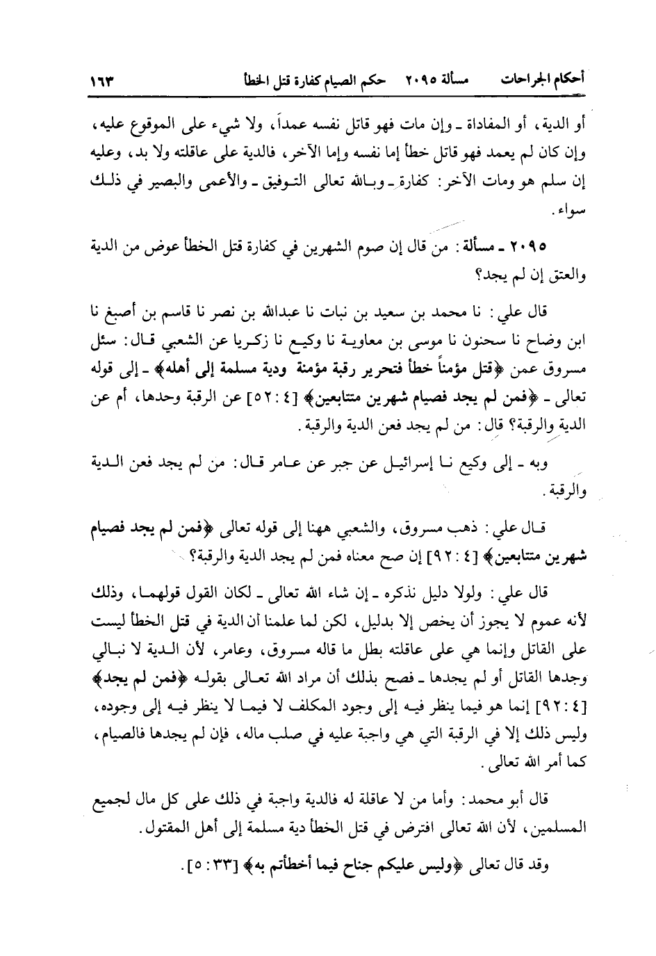 2095 - مَسْأَلَةٌ: مَنْ قَالَ إنَّ صَوْمَ الشَّهْرَيْنِ فِي كَفَّارَةِ قَتْلِ الْخَطَأِ عِوَضٌ مِنْ الدِّيَةِ وَالْعِتْقِ إنْ لَمْ يَجِدْ؟ قَالَ عَلِيٌّ: نا مُحَمَّدُ بْنُ سَعِيدِ بْنِ نَبَاتٍ نا عَبْدُ اللَّهِ بْنُ نَصْرٍ نا قَاسِمُ بْنُ أَصْبَغَ نا ابْنُ وَضَّاحٍ نا سَحْنُونٌ نا مُوسَى بْنُ مُعَاوِيَةَ نا وَكِيعٌ نا زَكَرِيَّا عَنْ الشَّعْبِيِّ قَالَ: سُئِلَ مَسْرُوقٌ عَمَّنْ {قَتَلَ مُؤْمِنًا خَطَأً فَتَحْرِيرُ رَقَبَةٍ مُؤْمِنَةٍ وَدِيَةٌ مُسَلَّمَةٌ إِلَى أَهْلِهِ} [النساء: 92] إلَى قَوْله تَعَالَى {فَمَنْ لَمْ يَجِدْ فَصِيَامُ شَهْرَيْنِ مُتَتَابِعَيْنِ} [النساء: 92] عَنْ الرَّقَبَةِ وَحْدَهَا، أَمْ عَنْ الدِّيَةِ وَالرَّقَبَةِ قَالَ: مَنْ لَمْ يَجِدْ فَعَنْ الدِّيَةِ وَالرَّقَبَةِ.
