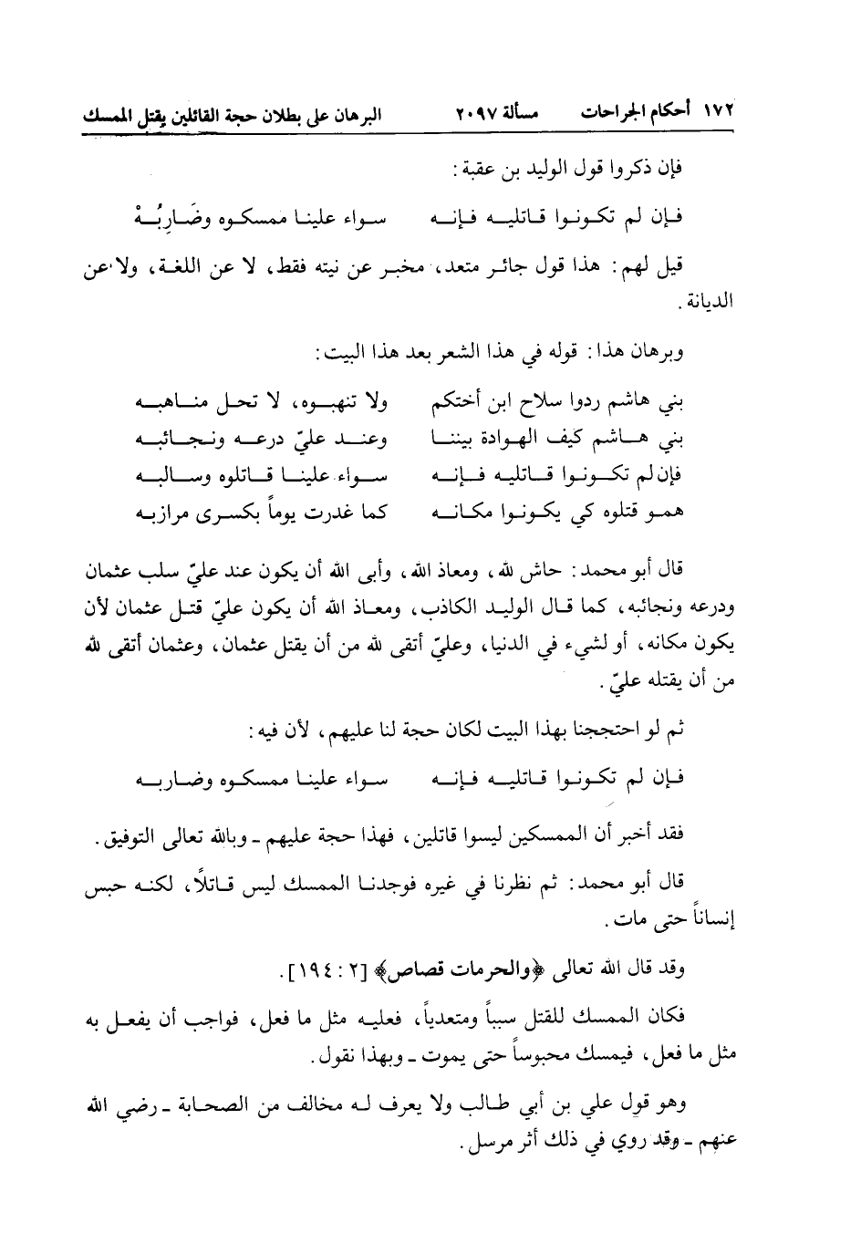 ثُمَّ لَوْ احْتَجَجْنَا بِهَذَا الْبَيْتِ لَكَانَ حُجَّةً لَنَا عَلَيْهِمْ، لِأَنَّ فِيهِ: فَإِنْ لَمْ تَكُونُوا قَاتِلِيهِ فَإِنَّهُ سَوَاءٌ عَلَيْنَا مُمْسِكُوهُ وَضَارِبُهُ فَقَدْ أَخْبَرَ أَنَّ الْمُمْسِكِينَ لَيْسُوا قَاتِلِينَ، فَهَذَا حُجَّةٌ عَلَيْهِمْ - وَبِاَللَّهِ تَعَالَى التَّوْفِيقُ.