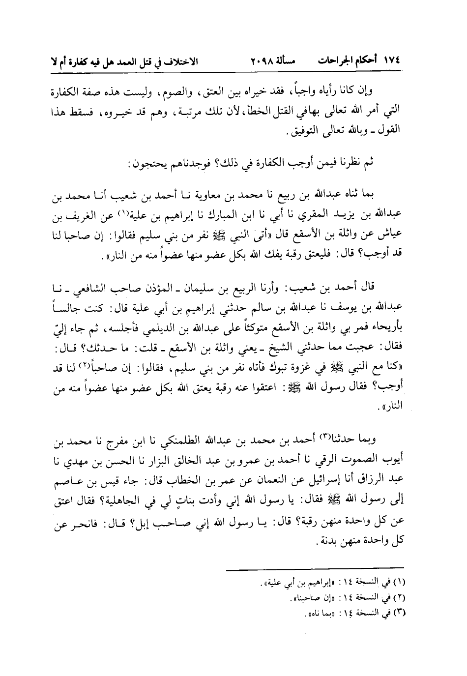 ثُمَّ نَظَرْنَا فِيمَنْ أَوْجَبَ الْكَفَّارَةَ فِي ذَلِكَ؟ فَوَجَدْنَاهُمْ يَحْتَجُّونَ: بِمَا ثَنَاهُ عَبْدُ اللَّهِ بْنُ رَبِيعٍ نا مُحَمَّدُ بْنُ مُعَاوِيَةَ نا أَحْمَدُ بْنُ شُعَيْبٍ أَنَا مُحَمَّدُ بْنُ عَبْدِ اللَّهِ بْنِ يَزِيدَ الْمُقْرِي نا أَبِي نا ابْنُ الْمُبَارَكِ نا إبْرَاهِيمُ بْنُ عُلَيَّةَ عَنْ الْغَرِيفِ بْنِ عَيَّاشٍ عَنْ وَاثِلَةَ بْنِ الْأَسْقَعِ قَالَ «أَتَى النَّبِيَّ - صَلَّى اللَّهُ عَلَيْهِ وَسَلَّمَ - نَفَرٌ مِنْ بَنِي سُلَيْمٍ فَقَالُوا: إنَّ صَاحِبًا لَنَا قَدْ أَوْجَبَ؟ قَالَ: فَلِيُعْتِقْ رَقَبَةً يَفُكَّ اللَّهُ بِكُلِّ عُضْوٍ مِنْهَا عُضْوًا مِنْهُ مِنْ النَّارِ» .