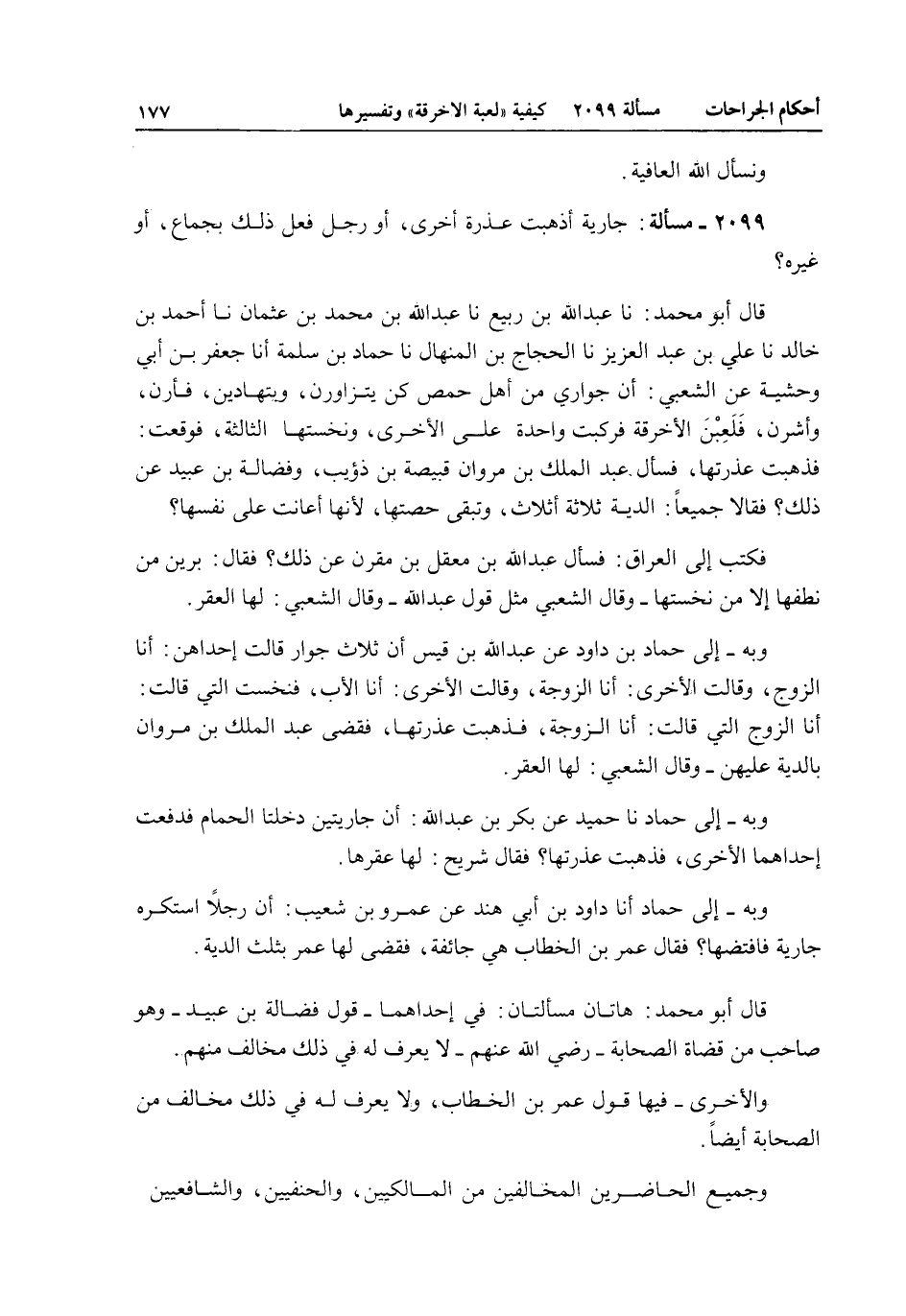 2099 - مَسْأَلَةٌ: جَارِيَةٌ أَذْهَبَتْ عُذْرَةَ أُخْرَى، أَوْ رَجُلٌ فَعَلَ ذَلِكَ بِجِمَاعٍ، أَوْ غَيْرِهِ؟ قَالَ أَبُو مُحَمَّدٍ: نا عَبْدُ اللَّهِ بْنُ رَبِيعٍ نا عَبْدُ اللَّهِ بْنُ مُحَمَّدِ بْنِ عُثْمَانَ نا أَحْمَدُ بْنُ خَالِدٍ نا عَلِيُّ بْنُ عَبْدِ الْعَزِيزِ نا الْحَجَّاجِ بْنِ الْمِنْهَالِ نا حَمَّادُ بْنُ سَلَمَةَ أَنَا جَعْفَرُ بْنُ أَبِي وَحْشِيَّةَ عَنْ الشَّعْبِيِّ: أَنَّ جَوَارِيَ مِنْ أَهْلِ حِمْصَ كُنَّ يَتَزَاوَرْنَ، وَيَتَهَادَيْنَ، فَأُرِنَ، وَأَشَرْنَ، فَلَعِبْنَ الْأَخْرِقَةَ فَرَكِبَتْ وَاحِدَةٌ عَلَى الْأُخْرَى، وَنَخَسَتْهَا الثَّالِثَةُ، فَوَقَعَتْ: فَذَهَبَتْ عُذْرَتُهَا، فَسَأَلَ عَبْدُ الْمَلِكِ بْنُ مَرْوَانَ قَبِيصَةَ بْنَ ذُؤَيْبٍ، وَفَضَالَةَ بْنَ عُبَيْدٍ عَنْ ذَلِكَ؟ فَقَالَا جَمِيعًا: الدِّيَةُ ثَلَاثَةُ أَثْلَاثٍ، وَتَبْقَى حِصَّتُهَا، لِأَنَّهَا أَعَانَتْ عَلَى نَفْسِهَا؟ فَكَتَبَ إلَى الْعِرَاقِ: فَسَأَلَ عَبْدَ اللَّهِ بْنَ مَعْقِلِ بْنِ مُقَرِّنٍ عَنْ ذَلِكَ؟ فَقَالَ: بُرِينَ مِنْ نَطْفِهَا إلَّا مَنْ نَخَسَتْهَا - وَقَالَ الشَّعْبِيُّ مِثْلَ قَوْلِ عَبْدِ اللَّهِ - وَقَالَ الشَّعْبِيُّ: لَهَا الْعُقْر.