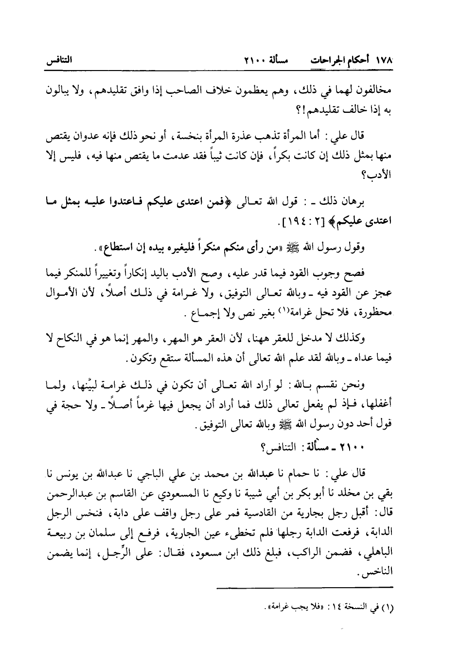 2100 - مَسْأَلَةٌ: التَّنَافُسُ؟ قَالَ عَلِيٌّ: نا حُمَامٌ نا عَبْدُ اللَّهِ بْنُ مُحَمَّدِ بْنِ عَلِيٍّ الْبَاجِيَّ نا عَبْدُ اللَّهِ بْنُ يُونُسَ نا بَقِيُّ بْنُ مَخْلَدٍ نا أَبُو بَكْرِ بْنُ أَبِي شَيْبَةَ نا وَكِيعٌ نا الْمَسْعُودِيُّ عَنْ الْقَاسِمِ بْنِ عَبْدِ الرَّحْمَنِ قَالَ: أَقْبَلَ رَجُلٌ بِجَارِيَةٍ مِنْ الْقَادِسِيَّةِ فَمَرَّ عَلَى رَجُلٍ وَاقِفٍ عَلَى دَابَّةٍ، فَنَخَسَ الرَّجُلُ الدَّابَّةَ، فَرَفَعَتْ الدَّابَّةُ رِجْلَهَا فَلَمْ تُخْطِئْ عَيْنَ الْجَارِيَةِ، فَرُفِعَ إلَى سَلْمَانَ بْنِ رَبِيعَةَ الْبَاهِلِيِّ، فَضَمَّنَ الرَّاكِبَ، فَبَلَغَ ذَلِكَ ابْنَ مَسْعُودٍ، فَقَالَ: عَلَى الرَّجُلِ، إنَّمَا يَضْمَن النَّاخِسُ.