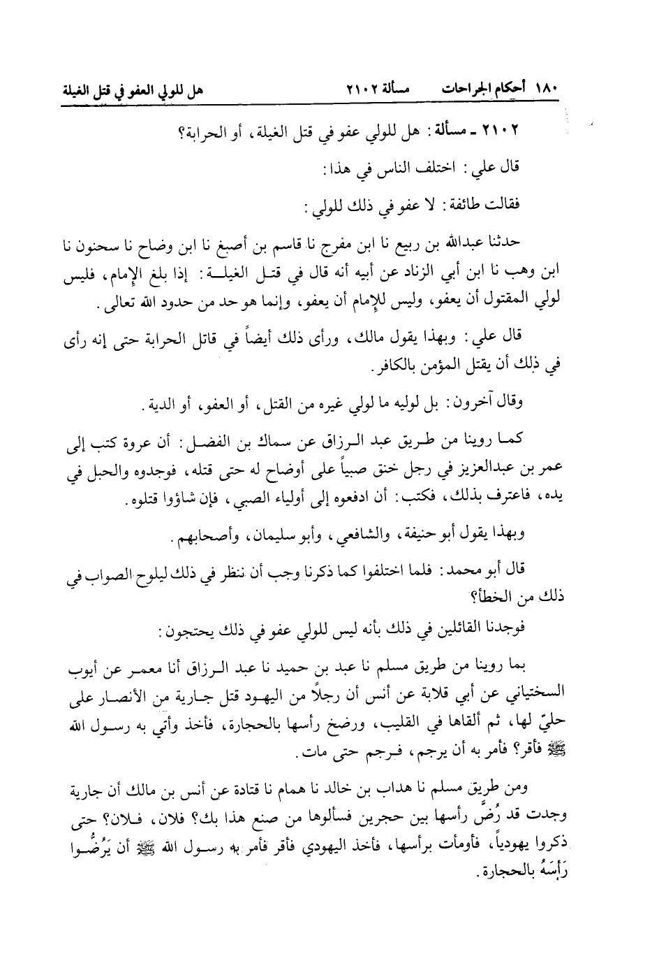 قَالَ أَبُو مُحَمَّدٍ: فَلَمَّا اخْتَلَفُوا كَمَا ذَكَرْنَا وَجَبَ أَنْ نَنْظُرَ فِي ذَلِكَ لِيَلُوحَ الصَّوَابُ فِي ذَلِكَ مِنْ الْخَطَأِ؟ فَوَجَدْنَا الْقَائِلِينَ فِي ذَلِكَ بِأَنَّهُ لَيْسَ لِلْوَلِيِّ عَفْوٌ فِي ذَلِكَ يَحْتَجُّونَ: بِمَا رُوِّينَا مِنْ طَرِيقِ مُسْلِمٍ نا عَبْدُ بْنُ حُمَيْدٍ نا عَبْدُ الرَّزَّاقِ نا مَعْمَرٌ عَنْ أَيُّوبَ السِّخْتِيَانِيِّ عَنْ أَبِي قِلَابَةَ عَنْ أَنَسٍ «أَنَّ رَجُلًا مِنْ الْيَهُودِ قَتَلَ جَارِيَةً مِنْ الْأَنْصَارِ عَلَى حُلِيٍّ لَهَا، ثُمَّ أَلْقَاهَا فِي الْقَلِيبِ، وَرَضَخَ رَأْسَهَا بِالْحِجَارَةِ، فَأُخِذَ وَأُتِيَ بِهِ رَسُولَ اللَّهِ - صَلَّى اللَّهُ عَلَيْهِ وَسَلَّمَ - فَأَقَرَّ، فَأَمَرَ بِهِ أَنْ يُرْجَمَ، فَرُجِمَ حَتَّى مَاتَ» .