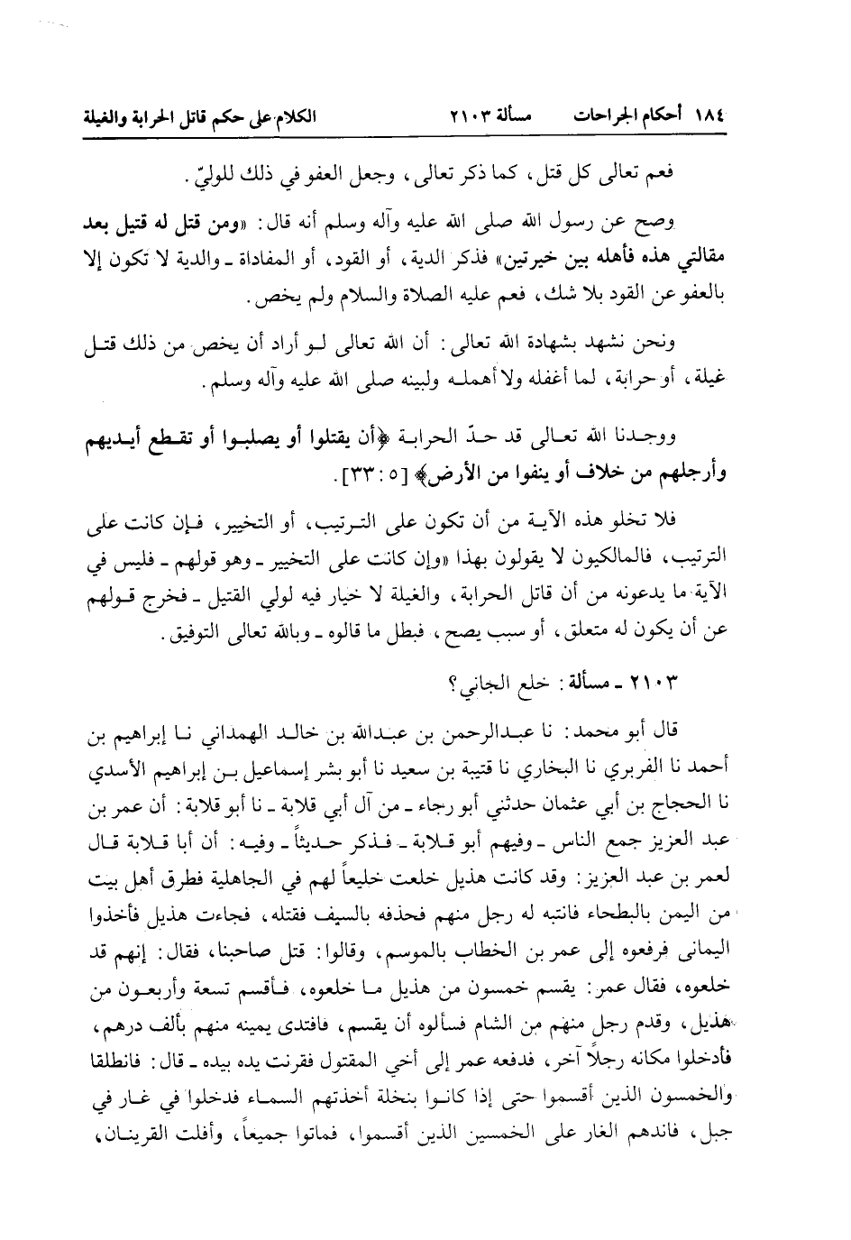 2103 - مَسْأَلَةٌ: خَلْعُ الْجَانِي؟ قَالَ أَبُو مُحَمَّدٍ: نا عَبْدُ الرَّحْمَنِ بْنُ عَبْدِ اللَّهِ بْنِ خَالِدٍ الْهَمْدَانِيُّ نا إبْرَاهِيمُ بْنُ أَحْمَدَ نا الْفَرَبْرِيُّ نا الْبُخَارِيُّ نا قُتَيْبَةُ بْنُ سَعِيدٍ نا أَبُو بِشْرٍ إسْمَاعِيلُ بْنُ إبْرَاهِيمَ الْأَسَدِيُّ نا الْحَجَّاجُ بْنُ أَبِي عُثْمَانَ حَدَّثَنِي أَبُو رَجَاءٍ - مِنْ آلِ أَبِي قِلَابَةَ - نا أَبُو قِلَابَةَ: أَنَّ عُمَرَ بْنَ عَبْدِ الْعَزِيزِ جَمَعَ النَّاسَ - وَفِيهِمْ أَبُو قِلَابَةَ - فَذَكَرَ حَدِيثًا - وَفِيهِ: أَنَّ أَبَا قِلَابَةَ قَالَ لِعُمَرَ بْنِ عَبْدِ الْعَزِيزِ: وَقَدْ كَانَتْ هُذَيْلٌ خَلَعَتْ خَلِيعًا لَهُمْ فِي الْجَاهِلِيَّةِ فَطَرَقَ أَهْلَ بَيْتٍ مِنْ الْيَمَنِ بِالْبَطْحَاءِ فَانْتَبَهَ لَهُ رَجُلٌ مِنْهُمْ فَحَذَفَهُ بِالسَّيْفِ فَقَتَلَهُ، فَجَاءَتْ هُذَيْلٌ فَأَخَذُوا الْيَمَانِيَّ فَرَفَعُوهُ إلَى عُمَرَ بْنِ الْخَطَّابِ بِالْمَوْسِمِ، وَقَالُوا: قَتَلَ صَاحِبَنَا، فَقَالَ: إنَّهُمْ قَدْ خَلَعُوهُ، فَقَالَ عُمَرُ: يُقْسِمُ خَمْسُونَ مِنْ هُذَيْلٍ مَا خَلَعُوهُ، فَأَقْسَمَ تِسْعَةٌ وَأَرْبَعُونَ مِنْ هُذَيْلٍ، وَقَدِمَ رَجُلٌ مِنْهُمْ مِنْ الشَّامِ فَسَأَلُوهُ أَنْ يُقْسِمَ، فَافْتَدَى يَمِينَهُ مِنْهُمْ بِأَلْفِ دِرْهَمٍ، فَأَدْخَلُوا مَكَانَهُ رَجُلًا آخَرَ، فَدَفَعَهُ عُمَرُ إلَى أَخِي الْمَقْتُولِ فَقُرِنَتْ يَدُهُ بِيَدِهِ - قَالَ: فَانْطَلَقَا وَالْخَمْسُونَ الَّذِينَ أَقْسَمُوا حَتَّى إذَا كَانُوا بِنَخْلَةٍ أَخَذَتْهُمْ السَّمَاءُ فَدَخَلُوا فِي غَارٍ فِي جَبَلٍ، فَانْهَدَمَ الْغَارُ عَلَى الْخَمْسِينَ الَّذِينَ أَقْسَمُوا، فَمَاتُوا جَمِيعًا، وَأَفْلَتَ الْقَرِينَانِ،