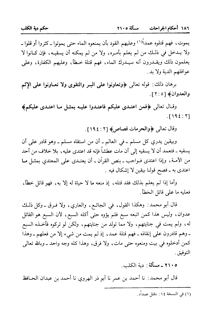 بُرْهَانُ ذَلِكَ: قَوْله تَعَالَى {وَتَعَاوَنُوا عَلَى الْبِرِّ وَالتَّقْوَى وَلا تَعَاوَنُوا عَلَى الإِثْمِ وَالْعُدْوَانِ} [المائدة: 2] ، وَقَالَ تَعَالَى {فَمَنِ اعْتَدَى عَلَيْكُمْ فَاعْتَدُوا عَلَيْهِ بِمِثْلِ مَا اعْتَدَى عَلَيْكُمْ} [البقرة: 194] ، وَقَالَ تَعَالَى {وَالْحُرُمَاتُ قِصَاصٌ} [البقرة: 194] ، وَبِيَقِينٍ يَدْرِي كُلُّ مُسْلِمٍ - فِي الْعَالَمِ - أَنَّ مَنْ اسْتَقَاهُ مُسْلِمٌ - وَهُوَ قَادِرٌ عَلَى أَنْ يَسْقِيَهُ - فَتَعَمَّدَ أَنْ لَا يَسْقِيَهُ إلَى أَنْ مَاتَ عَطَشًا فَإِنَّهُ قَدْ اعْتَدَى عَلَيْهِ، بِلَا خِلَافٍ مِنْ أَحَدٍ مِنْ الْأُمَّةِ، وَإِذَا اعْتَدَى فَوَاجِبٌ - بِنَصِّ الْقُرْآنِ - أَنْ يُعْتَدَى عَلَى الْمُعْتَدِي بِمِثْلِ مَا اعْتَدَى بِهِ - فَصَحَّ قَوْلُنَا بِيَقِينٍ لَا إشْكَالَ فِيهِ.