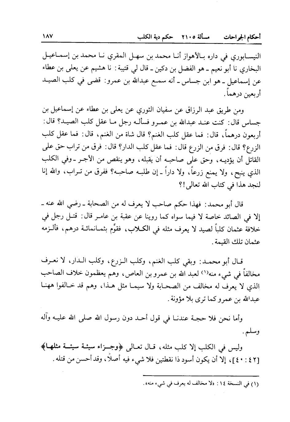 وَمِنْ طَرِيقِ عَبْدِ الرَّزَّاقِ عَنْ سُفْيَانَ الثَّوْرِيِّ عَنْ يَعْلَى بْنِ عَطَاءٍ عَنْ إسْمَاعِيلَ بْنِ جَسَّاسٍ قَالَ: كُنْت عِنْدَ عَبْدِ اللَّهِ بْنِ عَمْرٍو فَسَأَلَهُ رَجُلٌ مَا عَقْلُ كَلْبِ الصَّيْدِ؟ قَالَ: أَرْبَعُونَ دِرْهَمًا، قَالَ: فَمَا عَقْلُ كَلْبِ الْغَنَمِ؟ قَالَ شَاةٌ مِنْ الْغَنَمِ، قَالَ: فَمَا عَقْلُ كَلْبِ الزَّرْعِ؟ قَالَ: فَرَقٌ مِنْ الزَّرْعِ قَالَ: فَمَا عَقْلُ كَلْبِ الدَّارِ؟ قَالَ: فَرَقٌ مِنْ تُرَابٍ حَقٌّ عَلَى الْقَاتِلِ أَنْ يُؤَدِّيَهُ، وَحَقٌّ عَلَى صَاحِبِهِ أَنْ يَقْبَلَهُ، وَهُوَ يُنْقِصُ مِنْ الْأَجْرِ - وَفِي الْكَلْبِ الَّذِي يَنْبَحُ، وَلَا يَمْنَعُ زَرْعًا، وَلَا دَارًا - إنْ طَلَبَهُ صَاحِبُهُ؟ فَفِرْقٌ مِنْ تُرَابٍ، وَاَللَّهِ إنَّا لَنَجِدُ هَذَا فِي كِتَابِ اللَّه تَعَالَى؟ قَالَ أَبُو مُحَمَّدٍ: فَهَذَا حُكْمُ صَاحِبٍ لَا يُعْرَفُ لَهُ مِنْ الصَّحَابَةِ - رَضِيَ اللَّهُ عَنْهُ - مُخَالِفٌ إلَّا فِي الصَّائِدِ خَاصَّةً لَا فِيمَا سِوَاهُ كَمَا رُوِّينَا عَنْ عُقْبَةَ بْنِ عَامِرٍ قَالَ: قَتَلَ رَجُلٌ فِي خِلَافَةِ عُثْمَانَ كَلْبًا لِصَيْدٍ لَا يُعْرَفُ مِثْلُهُ فِي الْكِلَابِ، فَقُوِّمَ بِثَمَانِمِائَةِ دِرْهَمٍ، فَأَلْزَمَهُ عُثْمَانُ تِلْكَ الْقِيمَةَ.