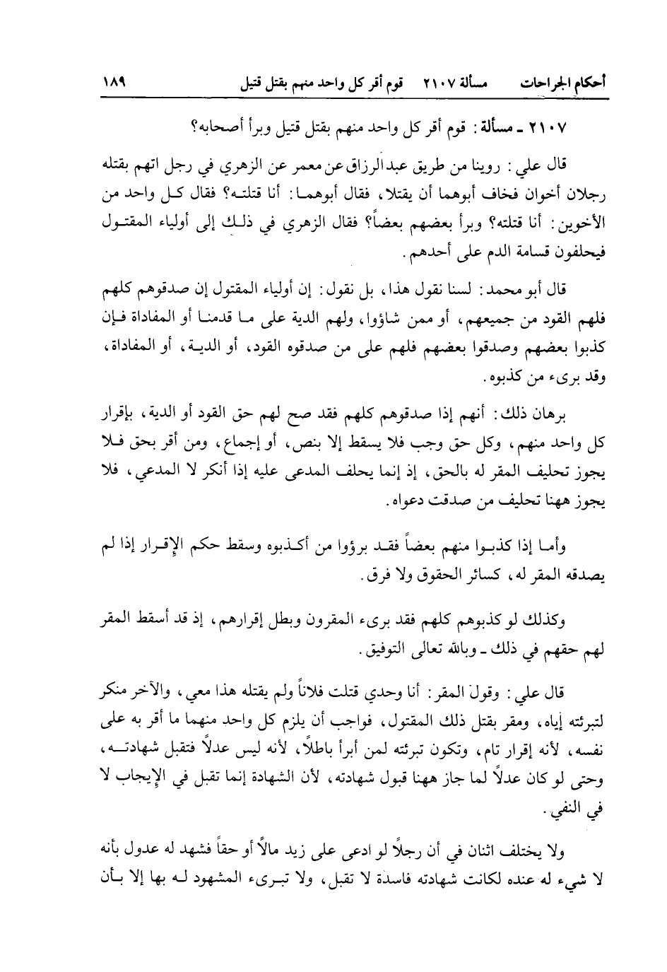 قَالَ عَلِيٌّ: وَقَوْلُ الْمُقِرِّ: أَنَا وَحْدِي قَتَلْت فُلَانًا وَلَمْ يَقْتُلْهُ هَذَا مَعِي، وَالْآخَرُ مُنْكِرٌ لِتَبْرِئَتِهِ إيَّاهُ، وَمُقِرٌّ بِقَتْلِ ذَلِكَ الْمَقْتُولِ، فَوَاجِبٌ أَنْ يَلْزَمَ كُلَّ وَاحِدٍ مِنْهُمَا مَا أَقَرَّ بِهِ عَلَى نَفْسِهِ، لِأَنَّهُ إقْرَارٌ تَامٌّ، وَتَكُونُ تَبْرِئَتُهُ لِمَنْ أَبْرَأَ بَاطِلًا، لِأَنَّهُ لَيْسَ عَدْلًا فَتُقْبَلُ شَهَادَتُهُ، وَحَتَّى لَوْ كَانَ عَدْلًا لَمَا جَازَ هَاهُنَا قَبُولُ شَهَادَتِهِ، لِأَنَّ الشَّهَادَةَ إنَّمَا تُقْبَلُ فِي الْإِيجَابِ لَا فِي النَّفْيِ.