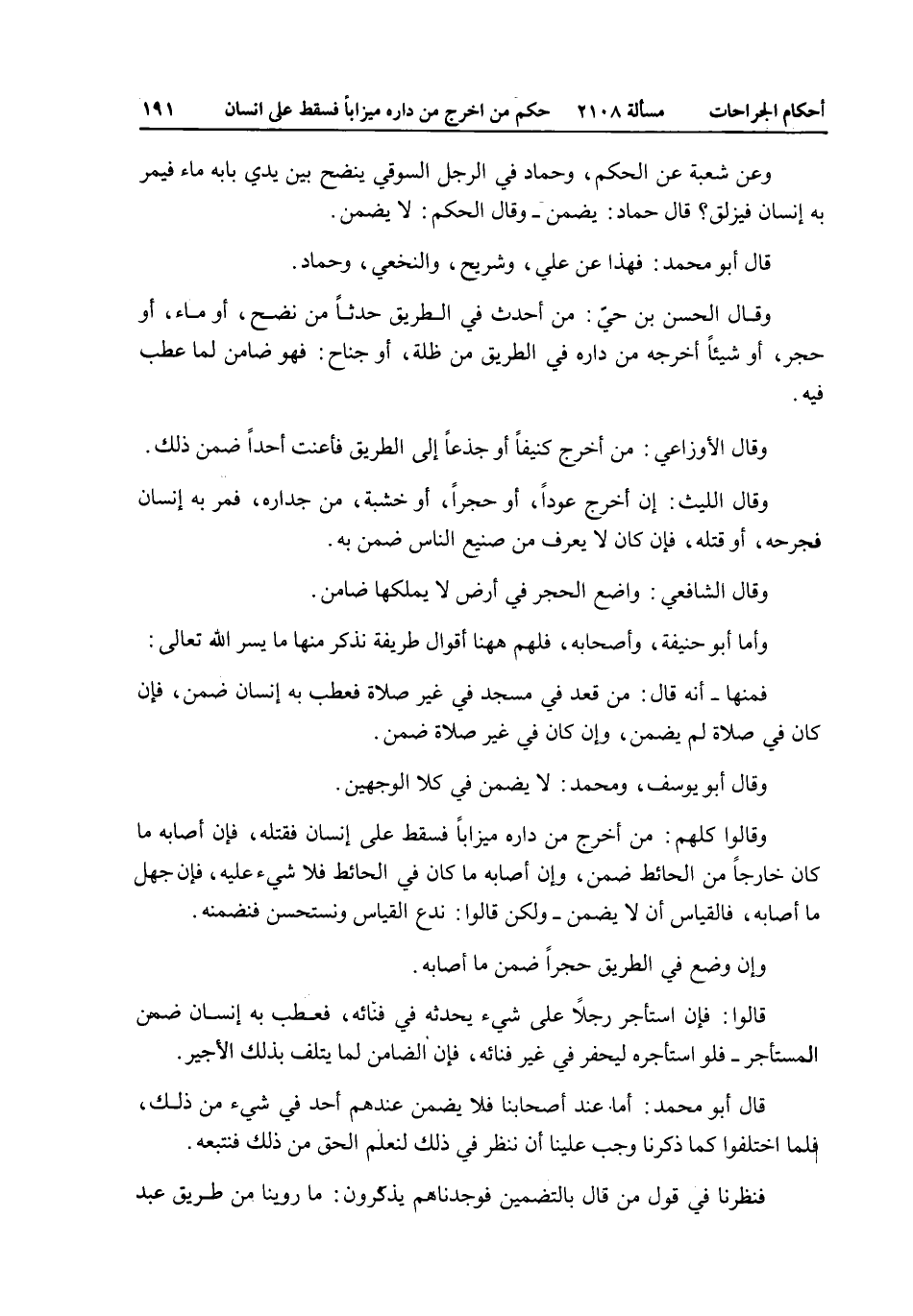 وَقَالَ الْحَسَنُ بْنُ حَيٍّ: مَنْ أَحْدَثَ فِي الطَّرِيقِ حَدَثًا مِنْ نَضْحٍ، أَوْ مَاءٍ، أَوْ حَجَرٍ، أَوْ شَيْئًا أَخْرَجَهُ مِنْ دَارِهِ فِي الطَّرِيقِ مِنْ ظُلَّةٍ، أَوْ جَنَاحٍ: فَهُوَ ضَامِنٌ لِمَا عَطِبَ فِيهِ.
