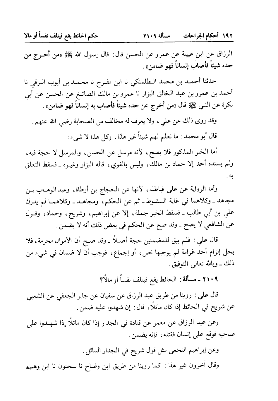 2109 - مَسْأَلَةٌ: الْحَائِطُ يَقَعُ فَيُتْلِفُ نَفْسًا أَوْ مَالًا؟ قَالَ عَلِيٌّ: رُوِّينَا مِنْ طَرِيقِ عَبْدِ الرَّزَّاقِ عَنْ سُفْيَانَ عَنْ جَابِرٍ الْجُعْفِيِّ عَنْ الشَّعْبِيِّ عَنْ شُرَيْحٍ فِي الْحَائِطِ إذَا كَانَ مَائِلًا، قَالَ: إنْ شَهِدُوا عَلَيْهِ ضَمِنَ.