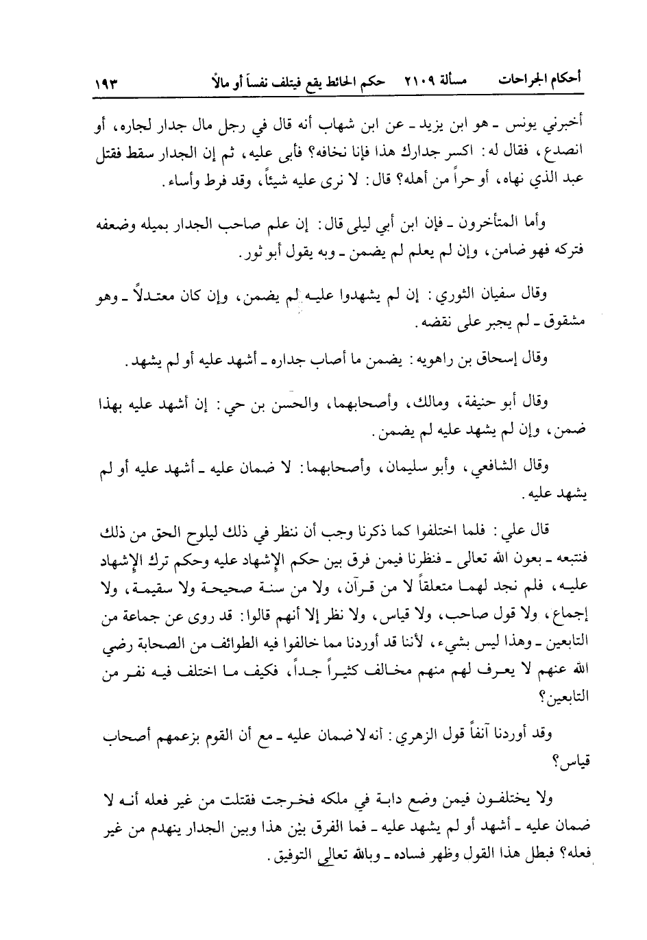 قَالَ عَلِيٌّ: فَلَمَّا اخْتَلَفُوا كَمَا ذَكَرْنَا وَجَبَ أَنْ نَنْظُرَ فِي ذَلِكَ لِيَلُوحَ الْحَقُّ مِنْ ذَلِكَ فَنَتْبَعَهُ - بِعَوْنِ اللَّهِ تَعَالَى - فَنَظَرْنَا فِيمَنْ فَرَّقَ بَيْنَ حُكْمِ الْإِشْهَادِ عَلَيْهِ وَحُكْمِ تَرْكِ الْإِشْهَادِ عَلَيْهِ، فَلَمْ نَجِدْ لَهُمَا مُتَعَلَّقًا لَا مِنْ قُرْآنٍ، وَلَا مِنْ سُنَّةٍ صَحِيحَةٍ وَلَا سَقِيمَةٍ، وَلَا إجْمَاعٍ، وَلَا قَوْلِ صَاحِبٍ، وَلَا قِيَاسٍ، وَلَا نَظَرٍ إلَّا أَنَّهُمْ قَالُوا: قَدْ رُوِيَ عَنْ جَمَاعَةٍ مِنْ التَّابِعِينَ - وَهَذَا لَيْسَ بِشَيْءٍ، لِأَنَّنَا قَدْ أَوْرَدْنَا مِمَّا خَالَفُوا فِيهِ الطَّوَائِفَ مِنْ الصَّحَابَةِ - رَضِيَ اللَّهُ عَنْهُمْ - لَا يُعْرَفُ لَهُمْ مِنْهُمْ مُخَالِفٌ كَثِيرًا جِدًّا، فَكَيْفَ مَا اخْتَلَفَ فِيهِ نَفَرٌ مِنْ التَّابِعِينَ؟ وَقَدْ أَوْرَدْنَا آنِفًا قَوْلَ الزُّهْرِيِّ: أَنَّهُ لَا ضَمَانَ عَلَيْهِ - مَعَ أَنَّ الْقَوْمَ بِزَعْمِهِمْ أَصْحَابُ قِيَاسٍ؟ وَلَا يَخْتَلِفُونَ فِيمَنْ وَضَعَ دَابَّةً فِي مِلْكِهِ فَخَرَجَتْ فَقَتَلَتْ مِنْ غَيْرِ فِعْلِهِ أَنَّهُ لَا ضَمَانَ عَلَيْهِ - أَشْهَدَ أَوْ لَمْ يُشْهِدْ عَلَيْهِ - فَمَا الْفَرْقُ بَيْنَ هَذَا وَبَيْنَ الْجِدَارِ يَنْهَدِمُ مِنْ غَيْرِ فِعْلِهِ؟ فَبَطَلَ هَذَا الْقَوْلُ وَظَهَرَ فَسَادُهُ وَبِاَللَّهِ تَعَالَى التَّوْفِيقُ.