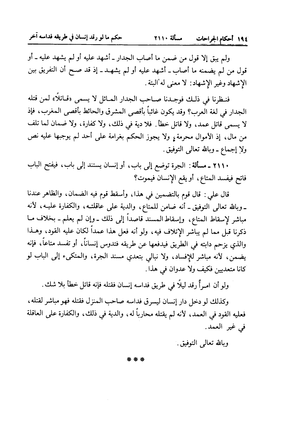 فَنَظَرْنَا فِي ذَلِكَ فَوَجَدْنَا صَاحِبَ الْجِدَارِ الْمَائِلِ لَا يُسَمَّى " قَاتِلًا " لِمَنْ قَتَلَهُ الْجِدَارُ فِي لُغَةِ الْعَرَبِ؟ وَقَدْ يَكُونُ غَائِبًا بِأَقْصَى الْمَشْرِقِ وَالْحَائِطُ بِأَقْصَى الْمَغْرِبِ، فَإِذْ لَا يُسَمَّى قَاتِلَ عَمْدٍ، وَلَا قَاتِلَ خَطَأٍ فَلَا دِيَةَ فِي ذَلِكَ، وَلَا كَفَّارَةَ، وَلَا ضَمَانَ لِمَا تَلِفَ مِنْ مَالٍ، إذْ الْأَمْوَالُ مُحَرَّمَةٌ، وَلَا يَجُوزُ الْحُكْمُ بِغَرَامَةٍ عَلَى أَحَدٍ لَمْ يُوجِبْهَا عَلَيْهِ نَصٌّ وَلَا إجْمَاعٌ - وَبِاَللَّهِ تَعَالَى التَّوْفِيقُ.