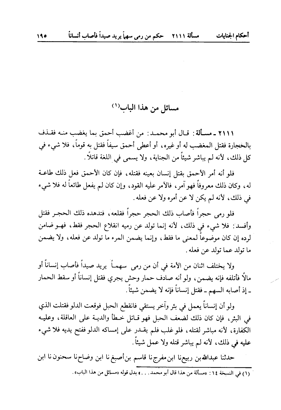 مَسَائِلُ مِنْ هَذَا الْبَابِ - مَسْأَلَةٌ: قَالَ أَبُو مُحَمَّدٍ: مَنْ أَغْضَبَ أَحْمَقَ بِمَا يُغْضَبُ مِنْهُ فَقَذَفَ بِالْحِجَارَةِ فَقَتَلَ الْمُغْضِبَ لَهُ أَوْ غَيْرَهُ، أَوْ أَعْطَى أَحْمَقَ سَيْفًا فَقَتَلَ بِهِ قَوْمًا، فَلَا شَيْءَ فِي كُلِّ ذَلِكَ، لِأَنَّهُ لَمْ يُبَاشِرْ شَيْئًا مِنْ الْجِنَايَةِ، وَلَا يُسَمَّى فِي اللُّغَةِ قَاتِلًا.