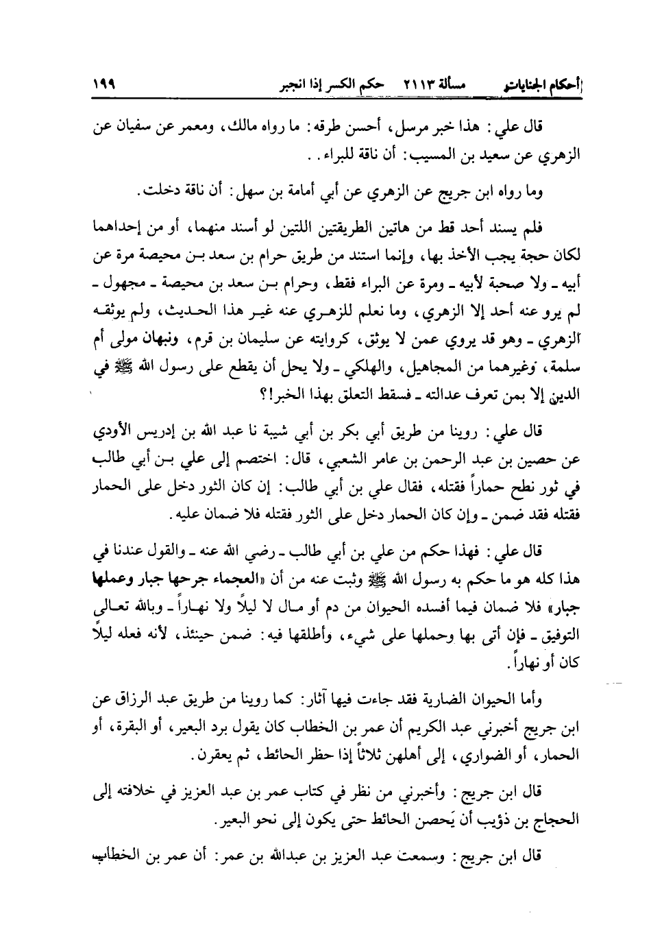وَمَا رَوَاهُ ابْنُ جُرَيْجٍ عَنْ الزُّهْرِيِّ عَنْ أَبِي أُمَامَةَ بْنِ سَهْلِ: أَنَّ نَاقَةً دَخَلَتْ. فَلَمْ يُسْنِدْ أَحَدٌ قَطُّ مِنْ هَاتَيْنِ الطَّرِيقَتَيْنِ اللَّتَيْنِ لَوْ أُسْنِدَ مِنْهُمَا، أَوْ مِنْ إحْدَاهُمَا لَكَانَ حُجَّةً يَجِبُ الْأَخْذُ بِهَا، وَإِنَّمَا اُسْتُنِدَ مِنْ طَرِيقِ حَرَامِ بْنِ سَعْدِ بْنِ مُحَيِّصَةُ مَرَّةً عَنْ أَبِيهِ - وَلَا صُحْبَةً لِأَبِيهِ - وَمَرَّةً عَنْ الْبَرَاءِ فَقَطْ، وَحَرَامُ بْنُ سَعْدِ بْنِ مُحَيِّصَةُ - مَجْهُولٌ - لَمْ يَرْوِ عَنْهُ أَحَدٌ إلَّا الزُّهْرِيُّ، وَمَا نَعْلَمُ لِلزُّهْرِيِّ عَنْهُ غَيْرَ هَذَا الْحَدِيثِ، وَلَمْ يُوَثِّقْهُ الزُّهْرِيُّ - وَهُوَ قَدْ يَرْوِي عَمَّنْ لَا يُوَثَّقُ، كَرِوَايَتِهِ عَنْ سُلَيْمَانَ بْنِ قَرْمٍ، وَنَبْهَانَ مَوْلَى أُمِّ سَلَمَةَ، وَغَيْرِهِمَا مِنْ الْمَجَاهِيلِ، وَالْهَلْكَى. وَلَا يَحِلُّ أَنْ يُقْطَعَ عَلَى رَسُولِ اللَّهِ - صَلَّى اللَّهُ عَلَيْهِ وَسَلَّمَ - فِي الدِّينِ إلَّا بِمَنْ تُعْرَفُ عَدَالَتُهُ - فَسَقَطَ التَّعَلُّقُ بِهَذَا الْخَبَرِ؟ قَالَ عَلِيٌّ: رُوِّينَا مِنْ طَرِيقِ أَبِي بَكْرِ بْنِ أَبِي شَيْبَةَ نا عَبْدُ اللَّهِ بْنُ إدْرِيسَ الْأَوْدِيُّ عَنْ حُصَيْنِ بْنِ عَبْدِ الرَّحْمَنِ بْنِ عَامِرٍ الشَّعْبِيِّ، قَالَ: اُخْتُصِمَ إلَى عَلِيِّ بْنِ أَبِي طَالِبٍ فِي ثَوْرٍ نَطَحَ حِمَارًا فَقَتَلَهُ، فَقَالَ عَلِيُّ بْنُ أَبِي طَالِبٍ: إنْ كَانَ الثَّوْرُ دَخَلَ عَلَى الْحِمَارِ فَقَتَلَهُ فَقَدْ ضَمِنَ - وَإِنْ كَانَ الْحِمَارُ دَخَلَ عَلَى الثَّوْرِ فَقَتَلَهُ فَلَا ضَمَانَ عَلَيْهِ.