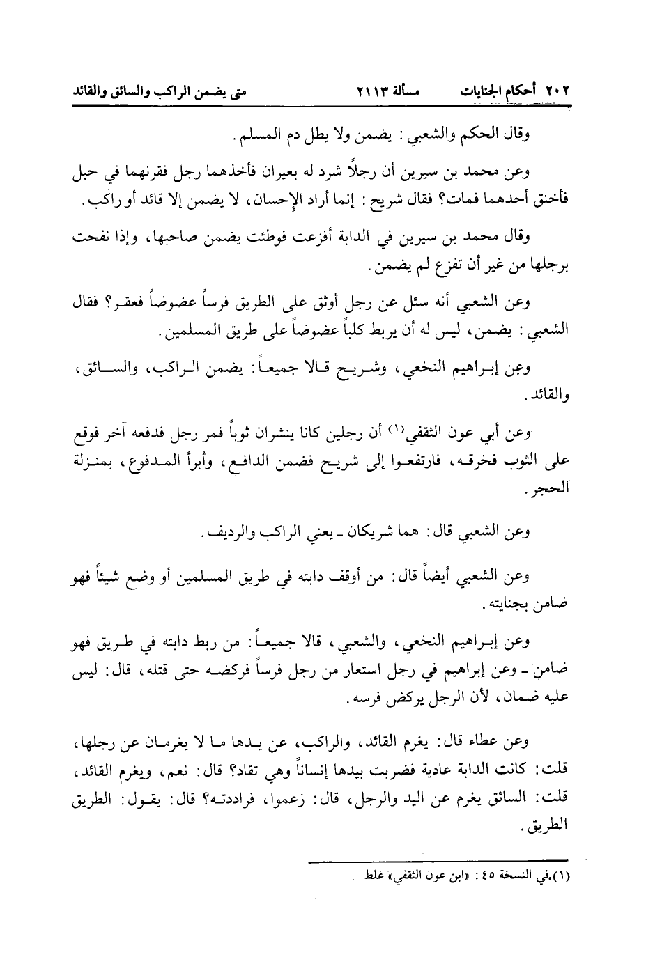وَعَنْ إبْرَاهِيمَ النَّخَعِيِّ، وَالشَّعْبِيِّ، قَالَا جَمِيعًا: مَنْ رَبَطَ دَابَّتَهُ فِي طَرِيقٍ فَهُوَ ضَامِنٌ - وَعَنْ إبْرَاهِيمَ فِي رَجُلٍ اسْتَعَارَ مِنْ رَجُلٍ فَرَسًا فَرَكَضَهُ حَتَّى قَتَلَهُ، قَالَ: لَيْسَ عَلَيْهِ ضَمَانٌ، لِأَنَّ الرَّجُلَ يُرَكِّضُ فَرَسَهُ.