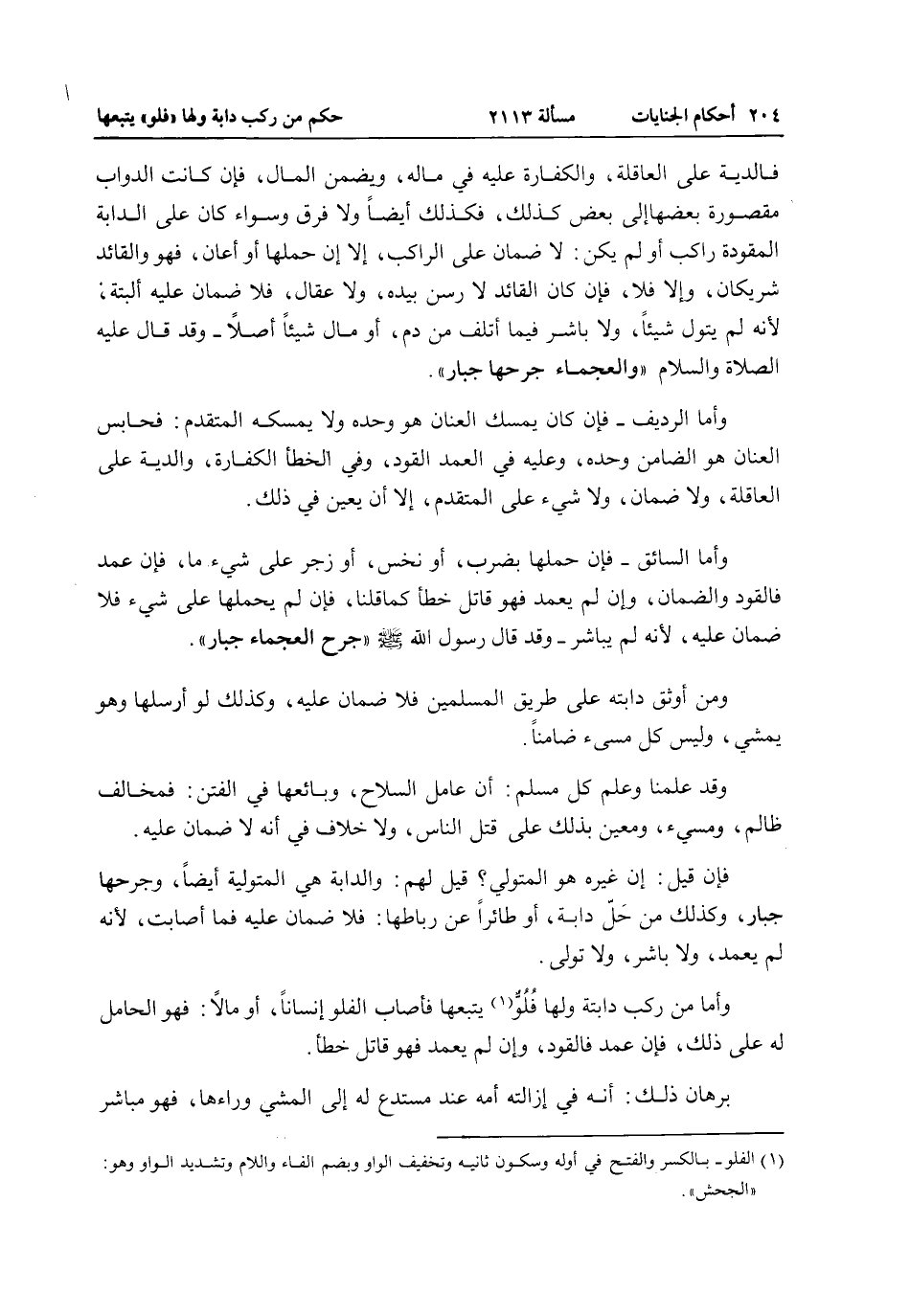 وَأَمَّا مَنْ رَكِبَ دَابَّتَهُ وَلَهَا فِلْوٌ يَتْبَعُهَا فَأَصَابَ الْفِلْوُ إنْسَانًا، أَوْ مَالًا: فَهُوَ الْحَامِلُ لَهُ عَلَى ذَلِكَ، فَإِنْ عَمَدَ فَالْقَوَدُ، وَإِنْ لَمْ يَعْمِدْ فَهُوَ قَاتِلٌ خَطَأً.