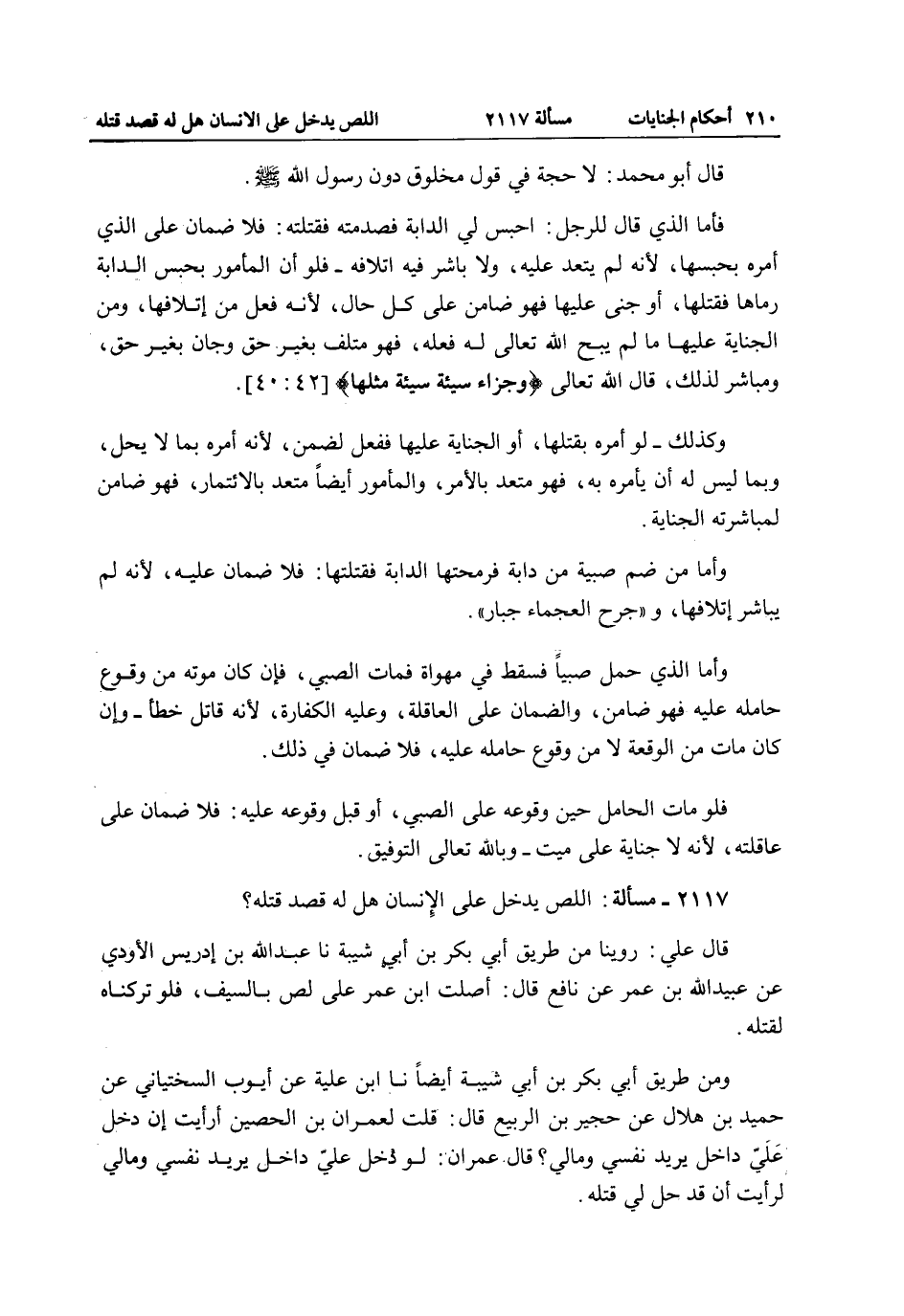 2117 - مَسْأَلَةٌ: اللِّصُّ يَدْخُلُ عَلَى الْإِنْسَانِ هَلْ لَهُ قَصْدُ قَتْلِهِ؟ قَالَ عَلِيٌّ: رُوِّينَا مِنْ طَرِيقِ أَبِي بَكْرِ بْنِ أَبِي شَيْبَةَ نا عَبْدُ اللَّهِ بْنُ إدْرِيسَ الْأَوْدِيُّ عَنْ عُبَيْدِ اللَّهِ بْنِ عُمَرَ عَنْ نَافِعٍ قَالَ: أَصْلَتَ ابْنُ عُمَرَ عَلَى لِصٍّ بِالسَّيْفِ، فَلَوْ تَرَكْنَاهُ لَقَتَلَهُ.