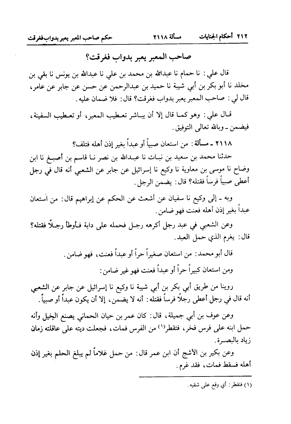صَاحِبُ الْمَعْبَرِ يَعْبُرُ بِدَوَابَّ فَغَرِقَتْ. قَالَ عَلِيٌّ: نا حُمَامٌ نا عَبْدُ اللَّهِ بْنُ مُحَمَّدِ بْنِ عَلِيٍّ نا عَبْدُ اللَّهِ بْنُ يُونُسَ نا بَقِيُّ بْنُ مَخْلَدٍ نا أَبُو بَكْرِ بْنُ أَبِي شَيْبَةَ نا حُمَيْدُ بْنُ عَبْدِ الرَّحْمَنِ عَنْ حَسَنٍ عَنْ جَابِرٍ عَنْ عَامِرٍ، قَالَ لِي: صَاحِبُ الْمَعْبَرِ يَعْبُرُ بِدَوَابَّ فَغَرِقَتْ؟ قَالَ: فَلَا ضَمَانَ عَلَيْهِ.