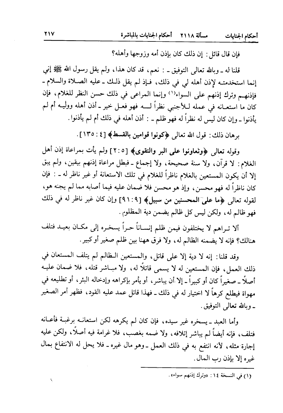 وقَوْله تَعَالَى {وَتَعَاوَنُوا عَلَى الْبِرِّ وَالتَّقْوَى} [المائدة: 2] وَلَمْ يَأْتِ بِمُرَاعَاةِ إذْنِ أَهْلِ الْغُلَامِ: لَا قُرْآنٌ، وَلَا سُنَّةٌ صَحِيحَةٌ، وَلَا إجْمَاعٌ - فَبَطَلَ مُرَاعَاةُ إذْنِهِمْ بِيَقِينٍ، وَلَمْ يَبْقَ إلَّا أَنْ يَكُونَ الْمُسْتَعِينُ بِالْغُلَامِ نَاظِرًا لِلْغُلَامِ فِي تِلْكَ الِاسْتِعَانَةِ أَوْ غَيْرَ نَاظِرٍ لَهُ -: فَإِنْ كَانَ نَاظِرًا لَهُ فَهُوَ مُحْسِنٌ، وَإِذَا هُوَ مُحْسِنٌ فَلَا ضَمَانَ عَلَيْهِ فِيمَا أَصَابَهُ مِمَّا لَمْ يَجْنِهِ هُوَ، لِقَوْلِهِ تَعَالَى {مَا عَلَى الْمُحْسِنِينَ مِنْ سَبِيلٍ} [التوبة: 91] وَإِنْ كَانَ غَيْرَ نَاظِرٍ لَهُ فِي ذَلِكَ فَهُوَ ظَالِمٌ لَهُ، وَلَكِنْ لَيْسَ كُلُّ ظَالِمٍ يَضْمَنُ دِيَةَ الْمَظْلُومِ.