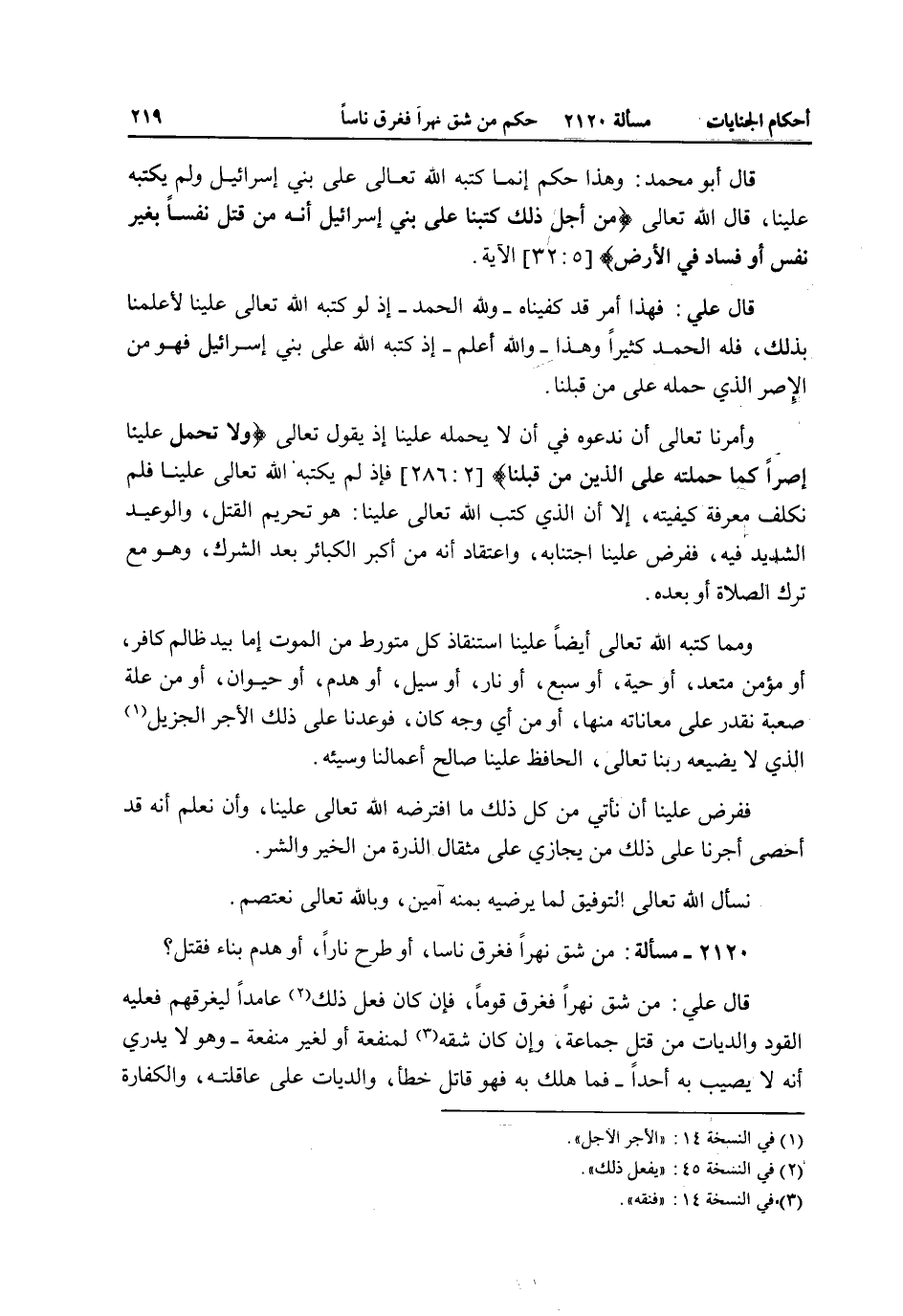2120 - مَسْأَلَةٌ: مَنْ شَقَّ نَهْرًا فَغَرَّقَ نَاسًا، أَوْ طَرَحَ نَارًا، أَوْ هَدَمَ بِنَاءً فَقَتَلَ؟ قَالَ عَلِيٌّ: مَنْ شَقَّ نَهْرًا فَغَرَّقَ قَوْمًا، فَإِنْ كَانَ فَعَلَ ذَلِكَ عَامِدًا لِيُغْرِقَهُمْ فَعَلَيْهِ الْقَوَدُ وَالدِّيَاتُ مِنْ قَتْلِ جَمَاعَةٍ، وَإِنْ كَانَ شَقَّهُ لِمَنْفَعَةٍ أَوْ لِغَيْرِ مَنْفَعَةٍ - وَهُوَ لَا يَدْرِي أَنَّهُ لَا يُصِيبُ بِهِ أَحَدًا - فَمَا هَلَكَ بِهِ فَهُوَ قَاتِلُ خَطَأٍ، وَالدِّيَاتُ عَلَى عَاقِلَتِهِ، وَالْكَفَّارَةُ