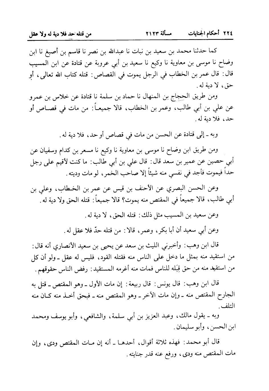 كَمَا حَدَّثَنَا مُحَمَّدُ بْنُ سَعِيدِ بْنِ نُبَاتٍ نا عَبْدُ اللَّهِ بْنُ نَصْرٍ نا قَاسِمُ بْنُ أَصْبَغَ نا ابْنُ وَضَّاحٍ نا مُوسَى بْنُ مُعَاوِيَةَ نا وَكِيعٌ نا سَعِيدُ بْنُ أَبِي عَرُوبَةَ عَنْ قَتَادَةَ عَنْ ابْنِ الْمُسَيِّبِ قَالَ: قَالَ عُمَرُ بْنُ الْخَطَّابِ فِي الرَّجُلِ يَمُوتُ فِي الْقِصَاصِ: قَتَلَهُ كِتَابُ اللَّهِ تَعَالَى، أَوْ حَقٌّ، لَا دِيَةَ لَهُ.