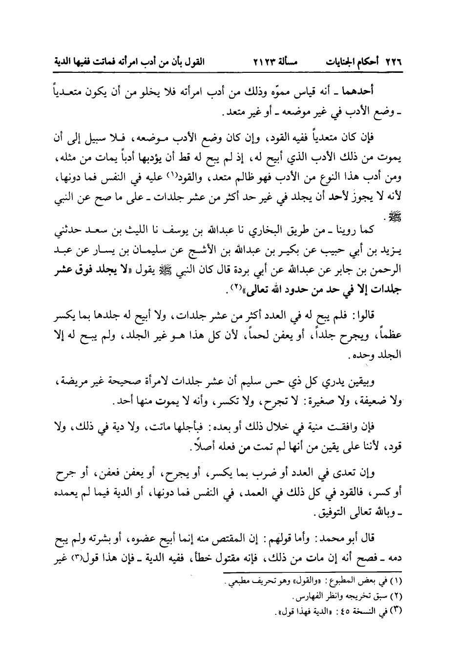 فَإِنْ كَانَ مُتَعَدِّيًا فَفِيهِ الْقَوَدُ، وَإِنْ كَانَ وَضَعَ الْأَدَبَ مَوْضِعَهُ، فَلَا سَبِيلَ إلَى أَنْ يَمُوتَ مِنْ ذَلِكَ الْأَدَبِ الَّذِي أُبِيحَ لَهُ، إذْ لَمْ يُبَحْ لَهُ قَطُّ أَنْ يُؤَدِّبَهَا أَدَبًا يُمَاتُ مَعَ مِثْلِهِ، وَمَنْ أَدَّبَ هَذَا النَّوْعَ مِنْ الْأَدَبِ فَهُوَ ظَالِمٌ مُتَعَدٍّ، وَالْقَوَدُ عَلَيْهِ فِي النَّفْسِ فَمَا دُونَهَا؛ لِأَنَّهُ لَا يَجُوزُ لِأَحَدٍ أَنْ يَجْلِدَ فِي غَيْرِ حَدٍّ أَكْثَرَ مِنْ عَشْرِ جَلَدَاتٍ - عَلَى مَا صَحَّ عَنْ النَّبِيِّ - صَلَّى اللَّهُ عَلَيْهِ وَسَلَّمَ -.