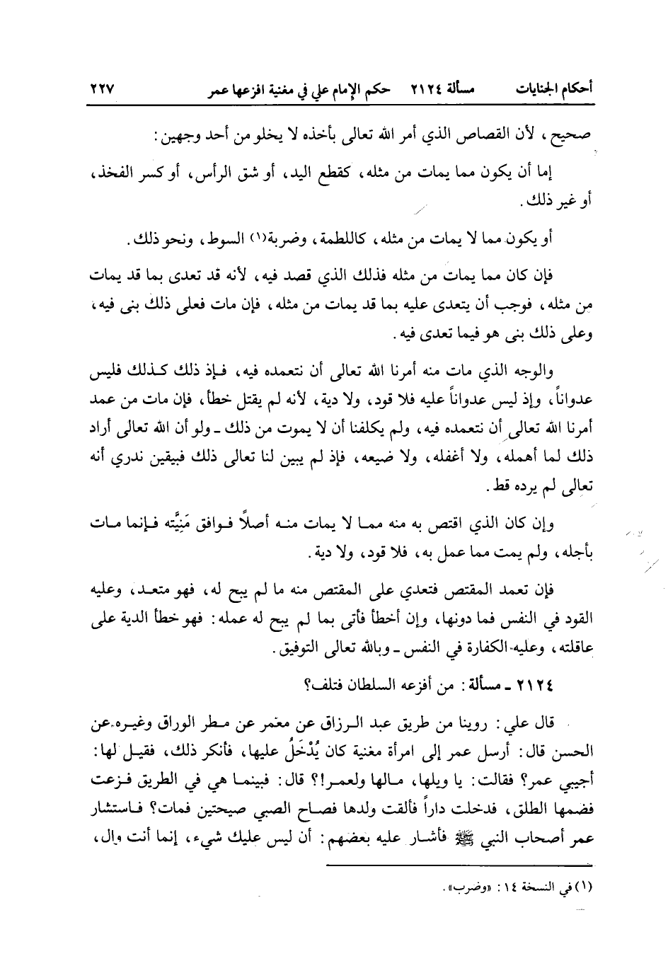 2124 - مَسْأَلَةٌ: مَنْ أَفْزَعَهُ السُّلْطَانُ فَتَلِفَ؟ قَالَ عَلِيٌّ: رُوِّينَا مِنْ طَرِيقِ عَبْدِ الرَّزَّاقِ عَنْ مَعْمَرٍ عَنْ مَطَرٍ الْوَرَّاقِ وَغَيْرِهِ عَنْ الْحَسَنِ قَالَ: أَرْسَلَ عُمَرُ إلَى امْرَأَةٍ مُغَنِّيَةٍ كَانَ يُدْخَلُ عَلَيْهَا، فَأَنْكَرَ ذَلِكَ، فَقِيلَ لَهَا: أَجِيبِي عُمَرَ؟ فَقَالَتْ: يَا وَيْلَهَا مَالَهَا وَلِعُمَرَ؟ قَالَ: فَبَيْنَمَا هِيَ فِي الطَّرِيقِ فَزِعَتْ، فَضَمَّهَا الطَّلْقُ، فَدَخَلَتْ دَارًا فَأَلْقَتْ وَلَدَهَا فَصَاحَ الصَّبِيُّ صَيْحَتَيْنِ فَمَاتَ؟ فَاسْتَشَارَ عُمَرَ أَصْحَابَ النَّبِيِّ - صَلَّى اللَّهُ عَلَيْهِ وَسَلَّمَ - فَأَشَارَ عَلَيْهِ بَعْضُهُمْ: أَنْ لَيْسَ عَلَيْك شَيْءٌ، إنَّمَا أَنْتَ وَالٍ،