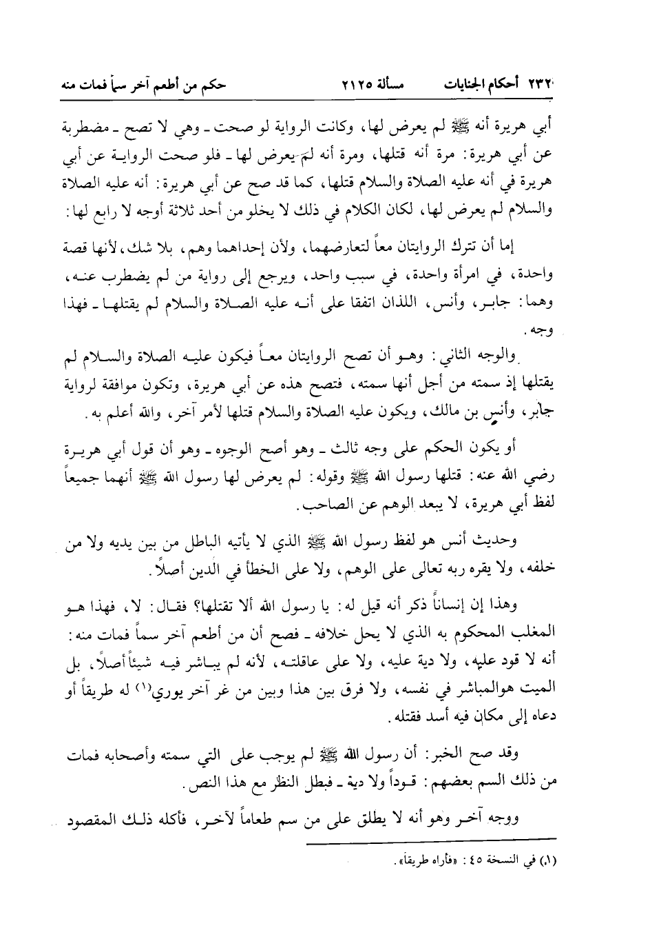 وَحَدِيثُ أَنَسٍ هُوَ لَفْظُ رَسُولِ اللَّهِ - صَلَّى اللَّهُ عَلَيْهِ وَسَلَّمَ - الَّذِي لَا يَأْتِيهِ الْبَاطِلُ مِنْ بَيْنِ يَدَيْهِ، وَلَا مِنْ خَلْفِهِ، وَلَا يُقِرُّهُ رَبُّهُ تَعَالَى عَلَى الْوَهْمِ، وَلَا عَلَى الْخَطَأِ فِي الدِّينِ أَصْلًا وَهَذَا أَنَّ إنْسَانًا ذَكَرَ أَنَّهُ قِيلَ لَهُ: يَا رَسُولَ اللَّهِ أَلَا تَقْتُلُهَا؟ فَقَالَ: لَا، فَهَذَا هُوَ الْمُغَلَّبُ الْمَحْكُومُ بِهِ الَّذِي لَا يَحِلُّ خِلَافُهُ - فَصَحَّ أَنَّ مَنْ أَطْعَمَ آخَرَ سُمًّا فَمَاتَ مِنْهُ: أَنَّهُ لَا قَوَدَ عَلَيْهِ، وَلَا دِيَةَ عَلَيْهِ، وَلَا عَلَى عَاقِلَتِهِ؛ لِأَنَّهُ لَمْ يُبَاشِرْ فِيهِ شَيْئًا أَصْلًا، بَلْ الْمَيِّتُ هُوَ الْمُبَاشِرُ فِي نَفْسِهِ، وَلَا فَرْقَ بَيْنَ هَذَا وَبَيْنَ مَنْ غَرَّ آخَرَ يُورِي لَهُ طَرِيقًا أَوْ دَعَاهُ إلَى مَكَان فِيهِ أَسَدٌ فَقَتَلَهُ.