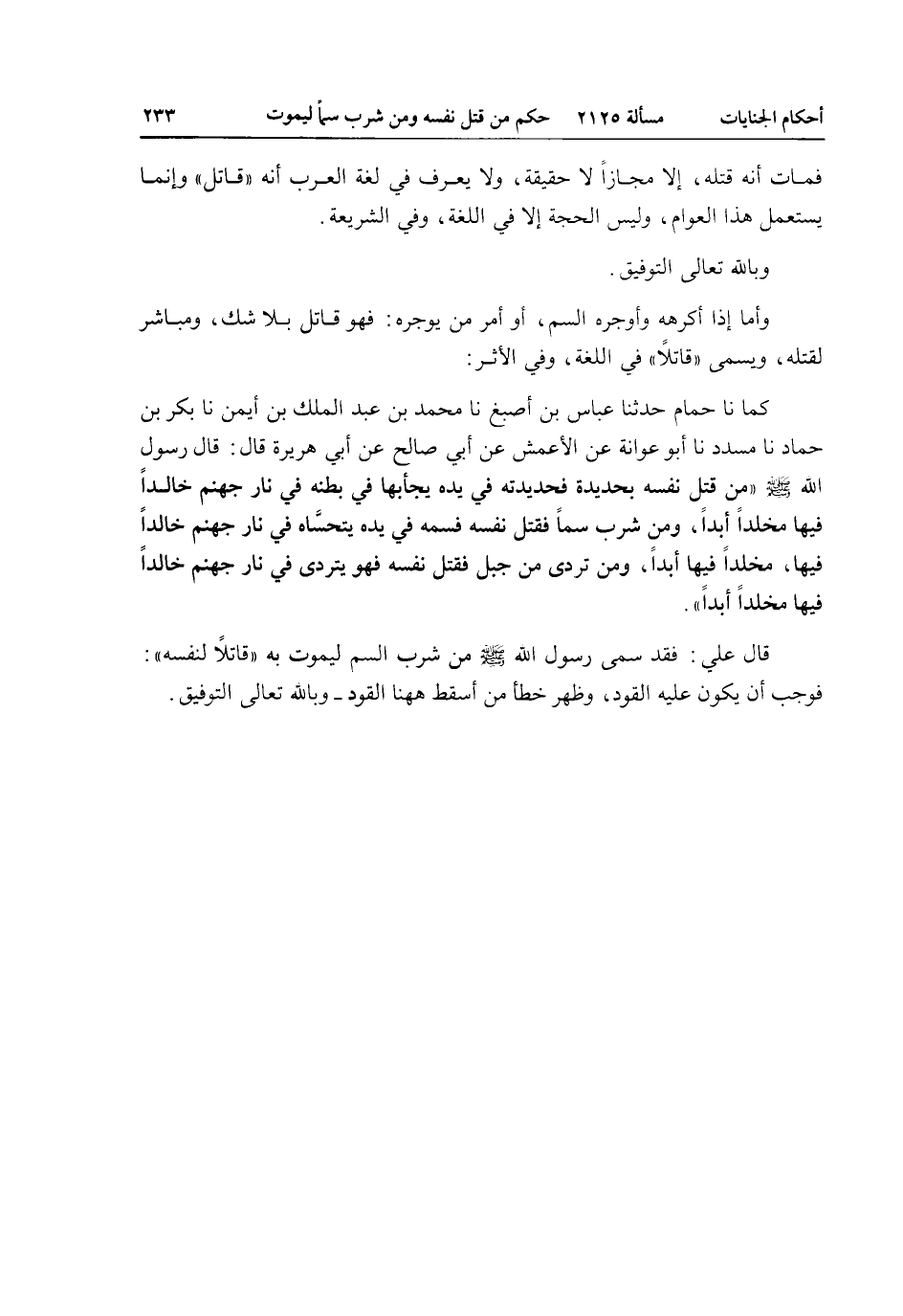 قَالَ عَلِيٌّ: فَقَدْ سَمَّى رَسُولُ اللَّهِ - صَلَّى اللَّهُ عَلَيْهِ وَسَلَّمَ - مَنْ شَرِبَ السُّمَّ لِيَمُوتَ بِهِ " قَاتِلًا لِنَفْسِهِ ": فَوَجَبَ أَنْ يَكُونَ عَلَيْهِ الْقَوَدُ، وَظَهَرَ خَطَأُ مَنْ أَسْقَطَ هَاهُنَا الْقَوَدَ - وَبِاَللَّهِ تَعَالَى التَّوْفِيقُ.