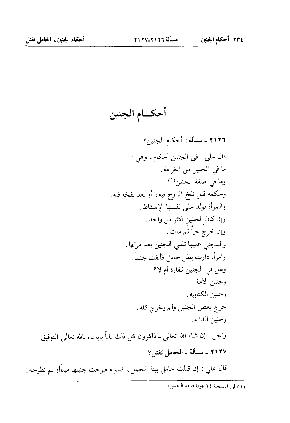 مَسْأَلَةٌ: أَحْكَامُ الْجَنِينِ؟ قَالَ عَلِيٌّ: فِي الْجَنِينِ أَحْكَامٌ، وَهِيَ: مَا فِي الْجَنِينِ مِنْ الْغَرَامَةِ.