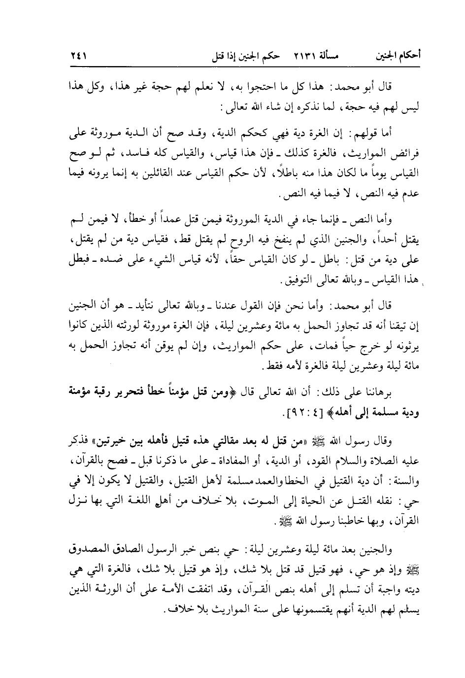 قَالَ أَبُو مُحَمَّدٍ: هَذَا كُلُّ مَا احْتَجُّوا بِهِ، لَا نَعْلَمُ لَهُمْ حُجَّةً غَيْرَ هَذَا، وَكُلُّ هَذَا لَيْسَ لَهُمْ فِيهِ حُجَّةٌ، لِمَا نَذْكُرُهُ إنْ شَاءَ اللَّهُ تَعَالَى: أَمَّا قَوْلُهُمْ: إنَّ الْغُرَّةَ دِيَةٌ فَهِيَ كَحُكْمِ الدِّيَةِ، وَقَدْ صَحَّ أَنَّ الدِّيَةَ مَوْرُوثَةٌ عَلَى فَرَائِضِ الْمَوَارِيثِ، فَالْغُرَّةُ كَذَلِكَ - فَإِنَّ هَذَا قِيَاسٌ، وَالْقِيَاسُ كُلُّهُ فَاسِدٌ، ثُمَّ لَوْ صَحَّ الْقِيَاسُ يَوْمًا مَا لَكَانَ هَذَا مِنْهُ بَاطِلًا؛ لِأَنَّ حُكْمَ الْقِيَاسِ عِنْدَ الْقَائِلِينَ بِهِ إنَّمَا يَرَوْنَهُ فِيمَا عُدِمَ فِيهِ النَّصُّ، لَا فِيمَا فِيهِ النَّصُّ.