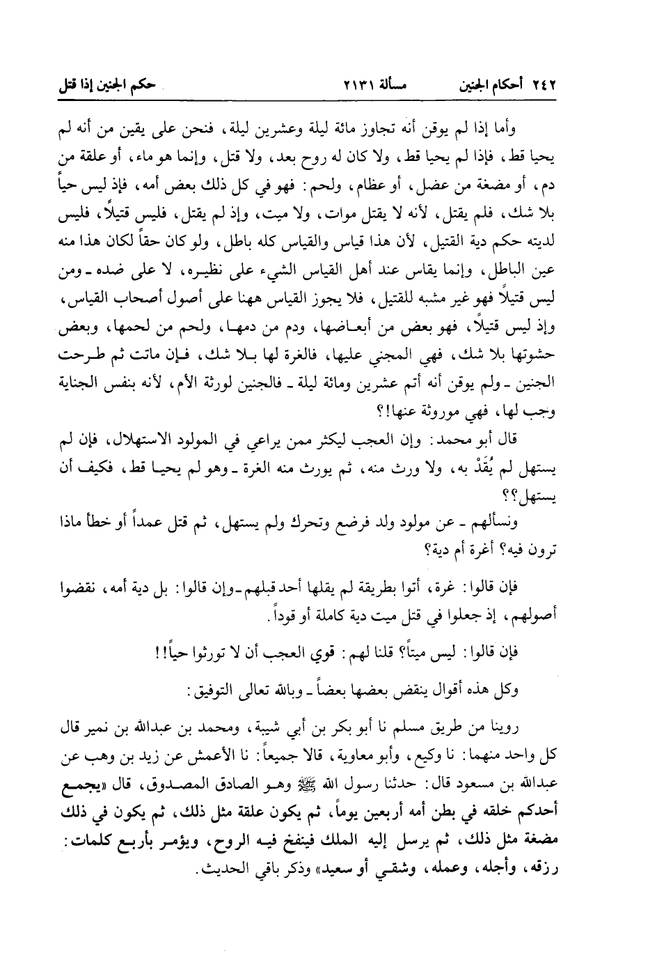وَأَمَّا إذَا لَمْ يُوقِنْ أَنَّهُ تَجَاوَزَ مِائَةَ لَيْلَةٍ وَعِشْرِينَ لَيْلَةً، فَنَحْنُ عَلَى يَقِينٍ مِنْ أَنَّهُ لَمْ يَحْيَا قَطُّ، فَإِذَا لَمْ يَحْيَا قَطُّ، وَلَا كَانَ لَهُ رُوحٌ بَعْدُ، وَلَا قُتِلَ، وَإِنَّمَا هُوَ مَاءٌ، أَوْ عَلَقَةٌ مِنْ دَمٍ، أَوْ مُضْغَةٌ مِنْ عَضَلٍ، أَوْ عِظَامٌ، وَلَحْمٌ: فَهُوَ فِي كُلِّ ذَلِكَ بَعْضُ أُمِّهِ، فَإِذْ لَيْسَ حَيًّا بِلَا شَكٍّ، فَلَمْ يُقْتَلْ، لِأَنَّهُ لَا يُقْتَلُ مَوَاتٌ، وَلَا مَيِّتٌ، وَإِذْ لَمْ يُقْتَلْ، فَلَيْسَ قَتِيلًا، فَلَيْسَ لِدِيَتِهِ حُكْمُ دِيَةِ الْقَتِيلِ؛ لِأَنَّ هَذَا قِيَاسٌ وَالْقِيَاسُ كُلُّهُ بَاطِلٌ، وَلَوْ كَانَ حَقًّا لَكَانَ هَذَا مِنْهُ عَيْنَ الْبَاطِلِ، وَإِنَّمَا يُقَاسُ عِنْدَ أَهْلِ الْقِيَاسِ الشَّيْءُ عَلَى نَظِيرِهِ، لَا عَلَى ضِدِّهِ - وَمَنْ لَيْسَ قَتِيلًا فَهُوَ غَيْرُ مُشْبِهٍ لِلْقَتِيلِ، فَلَا يَجُوزُ الْقِيَاسُ هَاهُنَا عَلَى أُصُولِ أَصْحَابِ الْقِيَاسِ، وَإِذْ لَيْسَ قَتِيلًا، فَهُوَ بَعْضٌ مِنْ أَبْعَاضِهَا، وَدَمٌ مِنْ دَمِهَا، وَلَحْمٌ مِنْ لَحْمِهَا، وَبَعْضُ حَشْوَتِهَا بِلَا شَكٍّ، فَهِيَ الْمَجْنِيُّ عَلَيْهَا، فَالْغُرَّةُ لَهَا بِلَا شَكٍّ، فَإِنْ مَاتَتْ ثُمَّ طَرَحَتْ الْجَنِينَ - وَلَمْ يُوقِنْ أَنَّهُ أَتَمَّ عِشْرِينَ وَمِائَةَ لَيْلَةٍ - فَالْجَنِينُ لِوَرَثَةِ الْأُمِّ؛ لِأَنَّهُ بِنَفْسِ الْجِنَايَةِ وَجَبَ لَهَا، فَهِيَ مَوْرُوثَةٌ عَنْهَا.