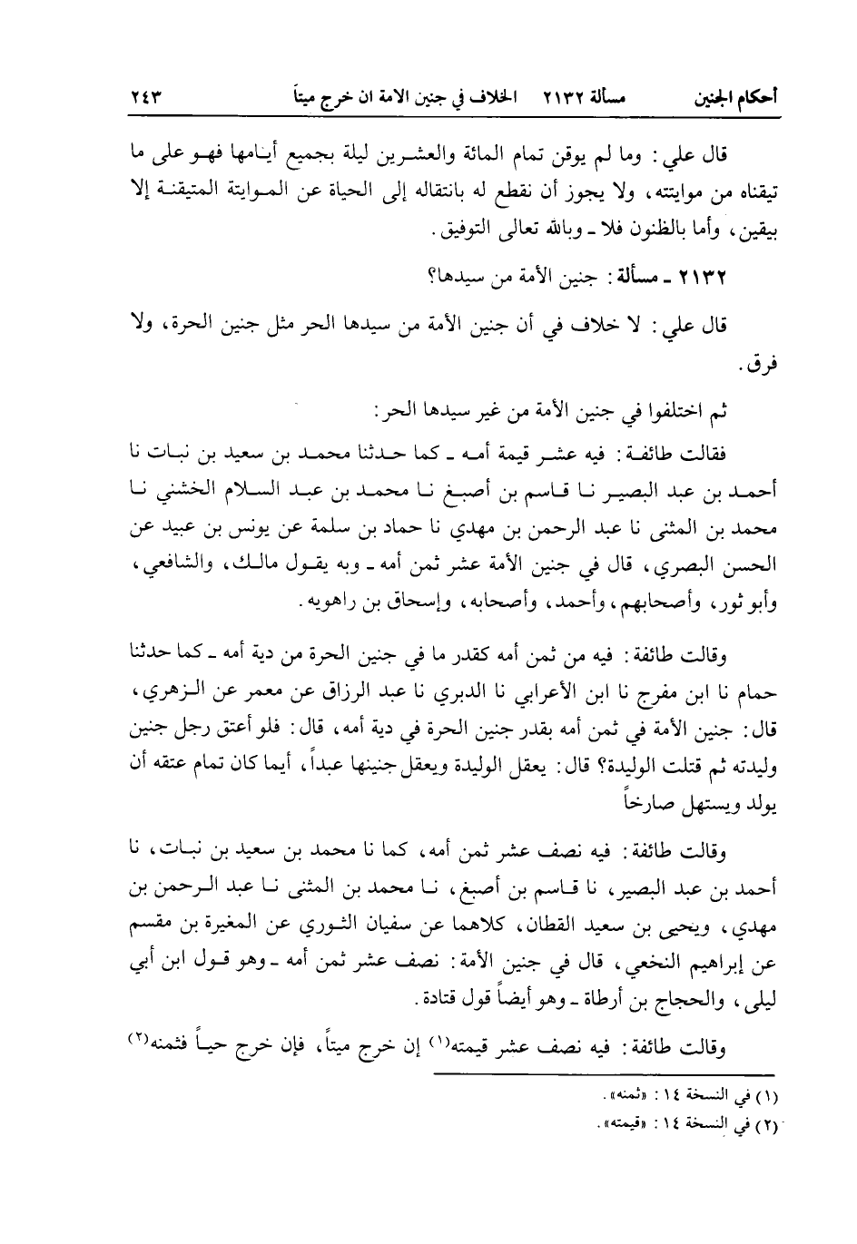 2132 - مَسْأَلَةٌ: جَنِينُ الْأَمَةِ مِنْ سَيِّدِهَا؟ قَالَ عَلِيٌّ: لَا خِلَافَ فِي أَنَّ جَنِينَ الْأَمَةِ مِنْ سَيِّدِهَا الْحُرِّ مِثْلُ جَنِينِ الْحُرَّةِ، وَلَا فَرْقَ.