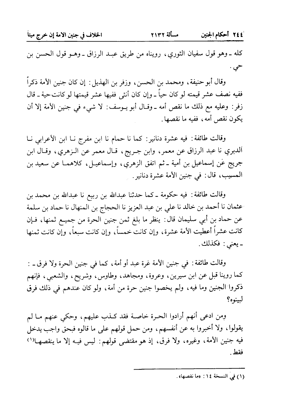 وَقَالَتْ طَائِفَةٌ: فِي جَنِينِ الْأَمَةِ غُرَّةُ عَبْدٍ أَوْ أَمَةٍ، كَمَا فِي جَنِينِ الْحُرَّةِ وَلَا فَرْقَ -: كَمَا رُوِّينَا قَبْلُ عَنْ ابْنِ سِيرِينَ، وَعُرْوَةَ، وَمُجَاهِدٍ، وَطَاوُسٍ، وَشُرَيْحٍ، وَالشَّعْبِيِّ، فَإِنَّهُمْ ذَكَرُوا الْجَنِينَ وَمَا فِيهِ، وَلَمْ يَخُصُّوا جَنِينَ حُرَّةٍ مِنْ أَمَةٍ، وَلَوْ كَانَ عِنْدَهُمْ فِي ذَلِكَ فَرْقٌ لَبَيَّنُوهُ؟ وَمَنْ ادَّعَى أَنَّهُمْ أَرَادُوا الْحُرَّةَ خَاصَّةً فَقَدْ كَذَبَ عَلَيْهِمْ، وَحَكَى عَنْهُمْ مَا لَمْ يَقُولُوا، وَلَا أَخْبَرُوا بِهِ عَنْ أَنْفُسِهِمْ، وَمَنْ حَمَلَ قَوْلَهُمْ عَلَى مَا قَالُوهُ فَبِحَقٍّ وَاجِبٍ يَدْخُلُ فِيهِ جَنِينُ الْأَمَةِ، وَغَيْرُهُ، وَلَا فَرْقَ، إذْ هُوَ مُقْتَضَى قَوْلِهِمْ: لَيْسَ فِيهِ إلَّا مَا يَنْقُصُهَا فَقَطْ.