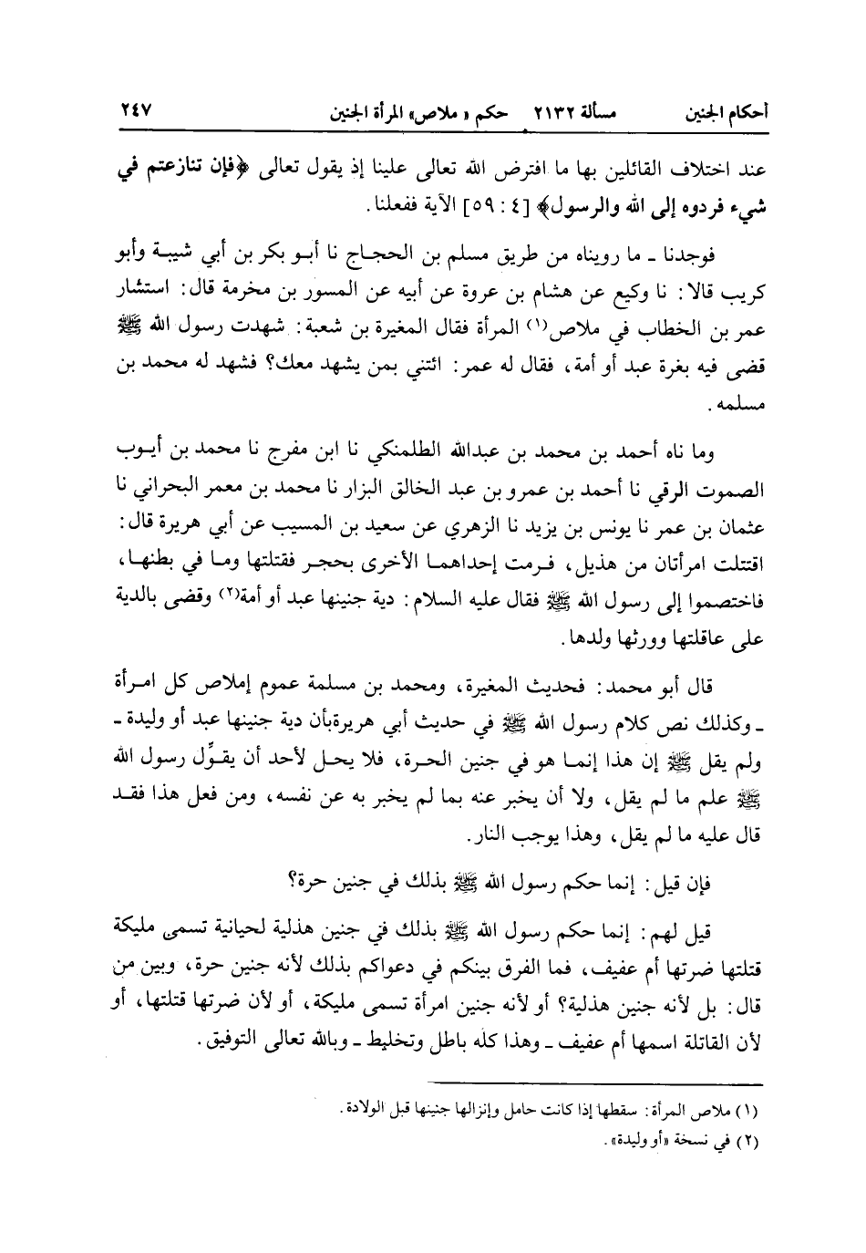قَالَ أَبُو مُحَمَّدٍ: فَحَدِيثُ الْمُغِيرَةِ، وَمُحَمَّدِ بْنِ مَسْلَمَةَ عُمُومُ إمْلَاصِ كُلِّ امْرَأَةٍ - وَكَذَلِكَ نَصُّ كَلَامِ رَسُولِ اللَّهِ - صَلَّى اللَّهُ عَلَيْهِ وَسَلَّمَ - فِي حَدِيثِ أَبِي هُرَيْرَةَ بِأَنَّ دِيَةَ جَنِينِهَا عَبْدٌ أَوْ وَلِيدَةٌ - وَلَمْ يَقُلْ - صَلَّى اللَّهُ عَلَيْهِ وَسَلَّمَ - إنَّ هَذَا إنَّمَا هُوَ فِي جَنِينِ الْحُرَّةِ، فَلَا يَحِلُّ لِأَحَدٍ أَنْ يُقَوِّلَ رَسُولَ اللَّهِ - صَلَّى اللَّهُ عَلَيْهِ وَسَلَّمَ - عِلْمَ مَا لَمْ يَقُلْ، وَلَا أَنْ يُخْبِرَ عَنْهُ بِمَا لَمْ يُخْبِرْ بِهِ عَنْ نَفْسِهِ، وَمَنْ فَعَلَ هَذَا فَقَدْ قَالَ عَلَيْهِ مَا لَمْ يَقُلْ، وَهَذَا يُوجِبُ النَّارَ.