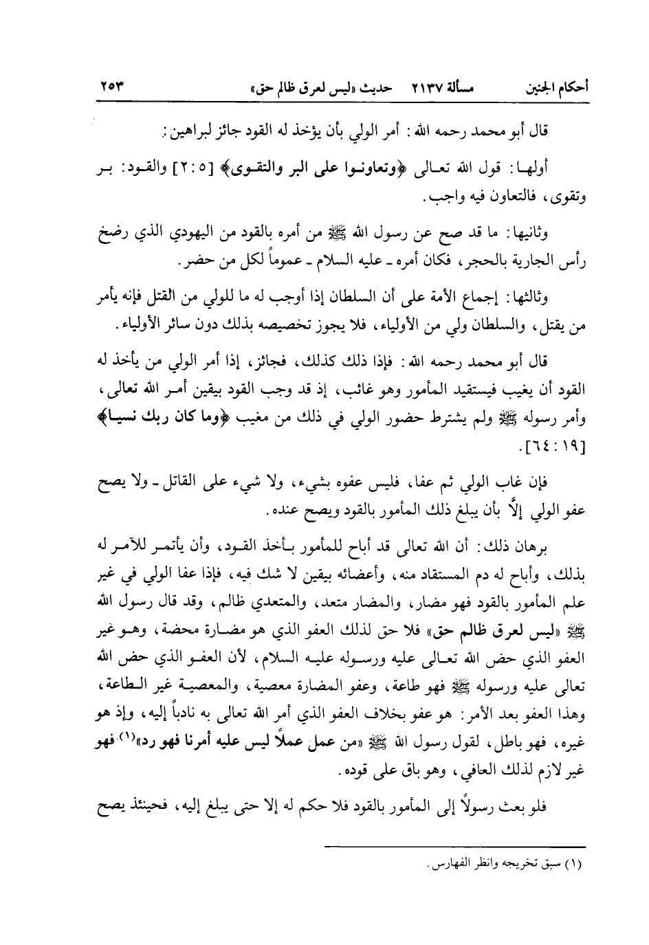 قَالَ أَبُو مُحَمَّدٍ - رَحِمَهُ اللَّهُ -: أَمْرُ الْوَلِيِّ بِأَنْ يُؤْخَذَ لَهُ الْقَوَدُ جَائِزٌ لِبَرَاهِينَ: أَوَّلُهَا: قَوْلُ اللَّهِ تَعَالَى {وَتَعَاوَنُوا عَلَى الْبِرِّ وَالتَّقْوَى} [المائدة: 2] وَالْقَوَدُ: بِرٌّ وَتَقْوَى، فَالتَّعَاوُنُ فِيهِ وَاجِبٌ.