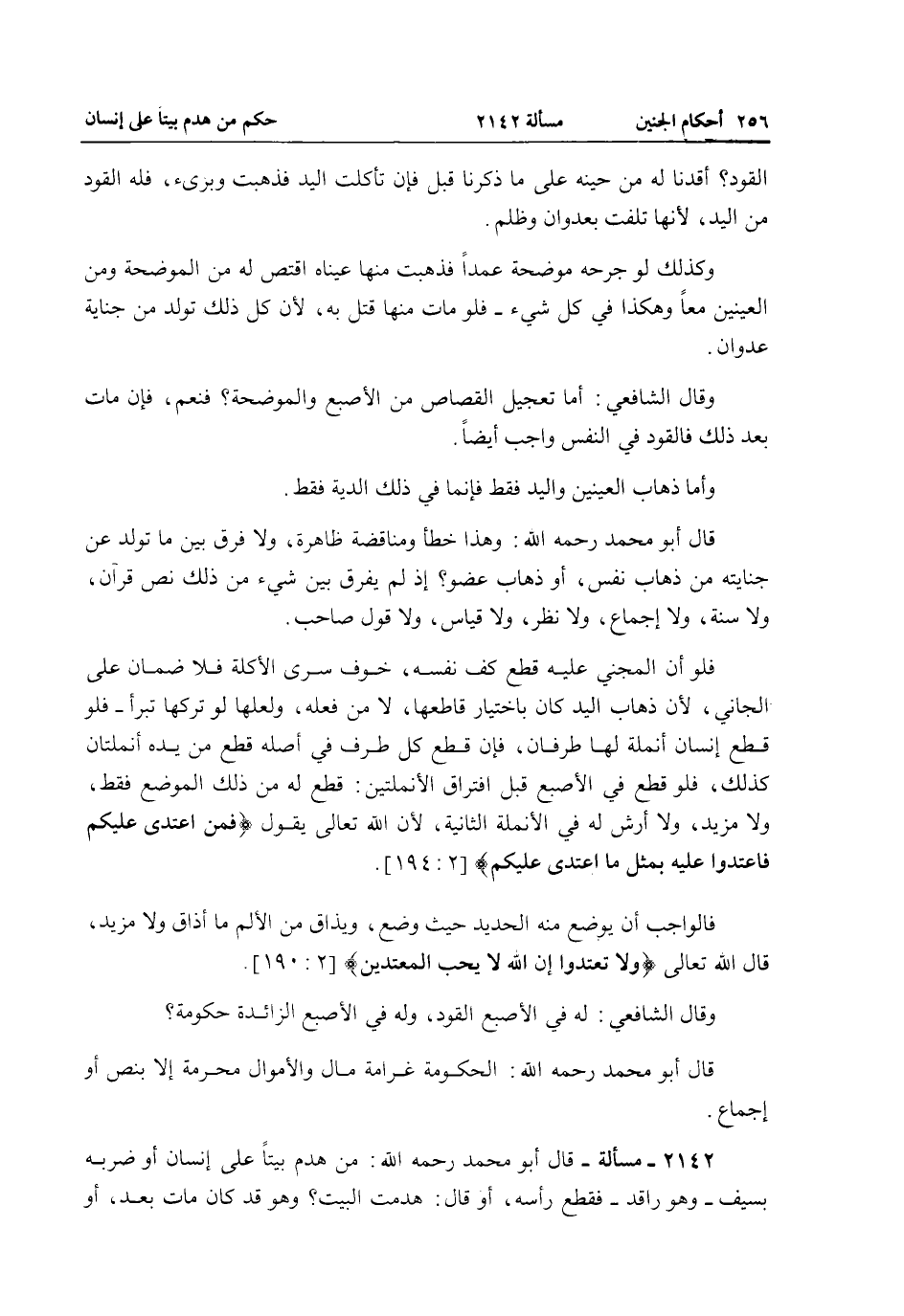 قَالَ أَبُو مُحَمَّدٍ - رَحِمَهُ اللَّهُ -: وَهَذَا خَطَأٌ وَمُنَاقَضَةٌ ظَاهِرَةٌ، وَلَا فَرْقَ بَيْنَ مَا تَوَلَّدَ عَنْ جِنَايَتِهِ مِنْ ذَهَابِ نَفْسٍ، أَوْ ذَهَابِ عُضْوٍ؟ إذْ لَمْ يُفَرِّقْ بَيْنَ شَيْءٍ مِنْ ذَلِكَ نَصُّ قُرْآنٍ، وَلَا سُنَّةٍ، وَلَا إجْمَاعٍ، وَلَا نَظَرٍ، وَلَا قِيَاسٍ، وَلَا قَوْلِ صَاحِبٍ.